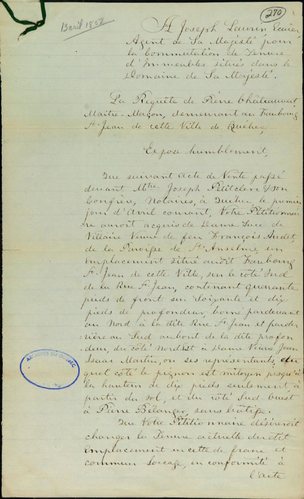 Requête de Pierre Châteauvert, maître maçon, demeurant dans le faubourg Saint-Jean à Québec, à l'attention de Joseph Laurin, écuyer, agent de Sa Majesté pour la commutation de la tenure d'immeubles situés dans le domaine de Sa Majesté, dans le but d'obtenir la commutation de la tenure actuelle d'un emplacement situé audit faubourg Saint-Jean, du côté sud de la rue Saint-Jean, que ledit Châteauvert a acquis de dame Luce de Villaire, veuve de François Audet, de la paroisse de Saint-Anselme, en celle de franc et commun socage, 13 avril 1857, Archives nationales à Québec, Fonds Ministère des Terres et Forêts, (03Q,E21,S64,SS5,SSS1,D270-1).