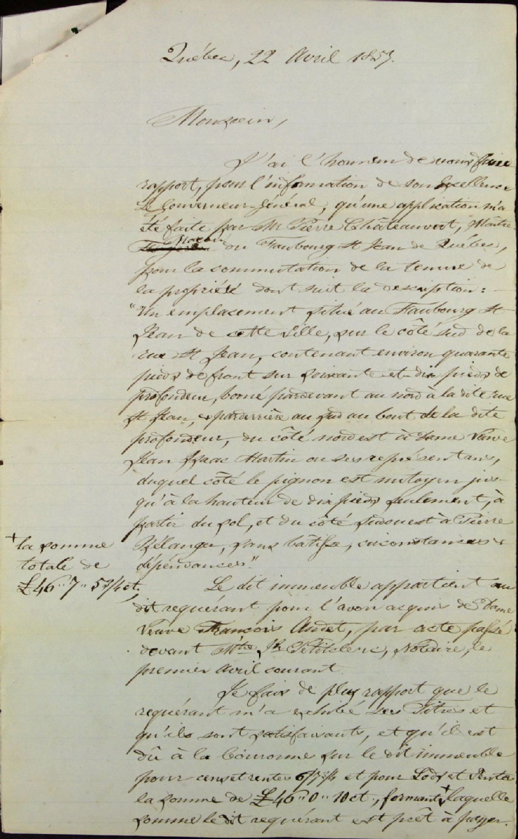 Rapport de Joseph Laurin, agent de la Couronne, à l'attention de l'Honorable commissaire des terres de la Couronne à Toronto, pour l'information de Son Excellence le gouverneur général, à la suite de la demande à lui faite par monsieur Pierre Châteauvert, maître maçon, du faubourg Saint-Jean de Québec, pour obtenir la commutation de la tenure d'un emplacement situé audit faubourg Saint-Jean, du côté sud de la rue Saint-Jean, que ledit Châteauvert a acquis de la dame veuve de François Audet, le 1er avril courant, et requête dudit Laurin pour savoir s'il plaît à Son Excellence de sanctionner l'évaluation à l'amiable qu'il a faite dudit emplacement