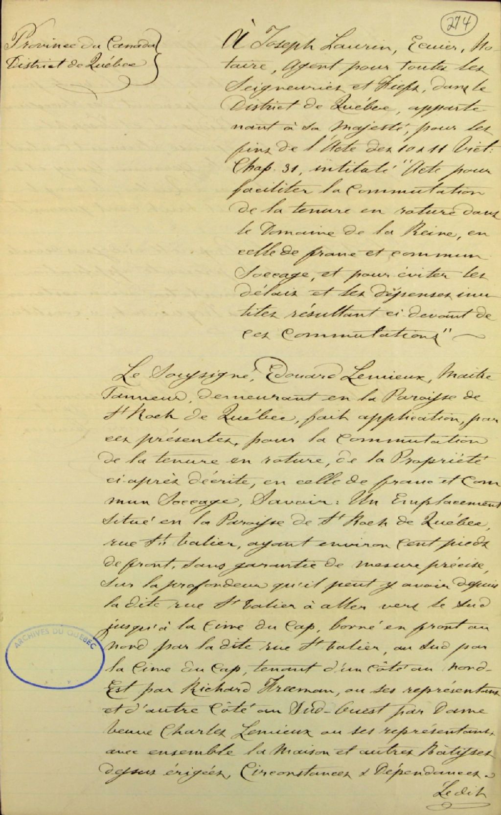 Requête d'Édouard Lemieux, maître tanneur, demeurant en la paroisse de Saint-Roch à Québec, faisant par [François-Léon] Gauvreau, son agent, à Joseph Laurin, écuyer, notaire, agent pour toutes les seigneuries et fiefs dans le District de Québec appartenant à Sa Majesté, pour obtenir la commutation de la tenure d'un emplacement situé sur la rue Saint-Vallier, en ladite paroisse, pour les fins de l'acte intitulé «Acte pour faciliter la commutation de la tenure des terres en roture dans le domaine de la Reine en celle de franc et commun socage, et pour éviter les délais et les dépenses inutiles résultant ci-devant de ces commutations»