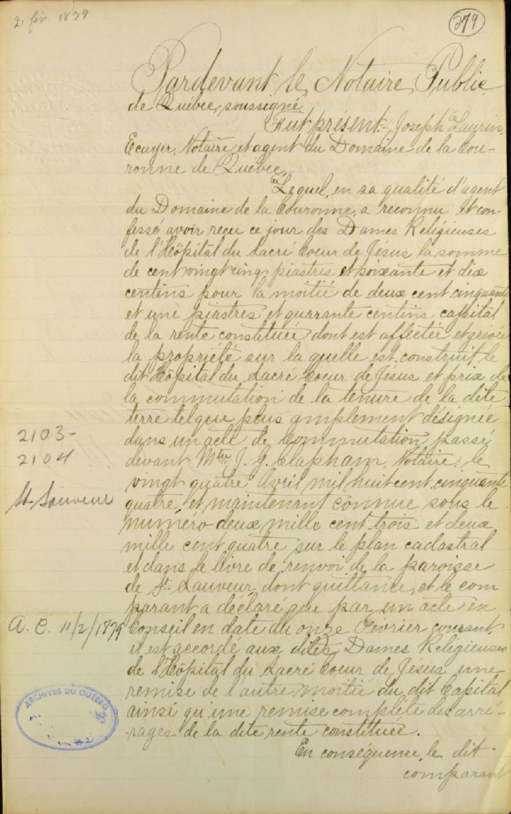 Quittance générale de Joseph Laurin, écuyer, notaire et agent du domaine de la Couronne de Québec, faisant en sadite qualité, en faveur des Dames Religieuses de l'Hôpital du Sacré-Coeur-de-Jésus, pour le montant total de la rente constituée dont est affectée la propriété sur laquelle est construite ledit Hôpital, et pour le prix de la commutation de la tenure de ladite terre, par-devant Louis Falardeau, notaire public, 21 février 1879, Archives nationales à Québec, Fonds Ministère des Terres et Forêts, (03Q,E21,S64,SS5,SSS1,D279).