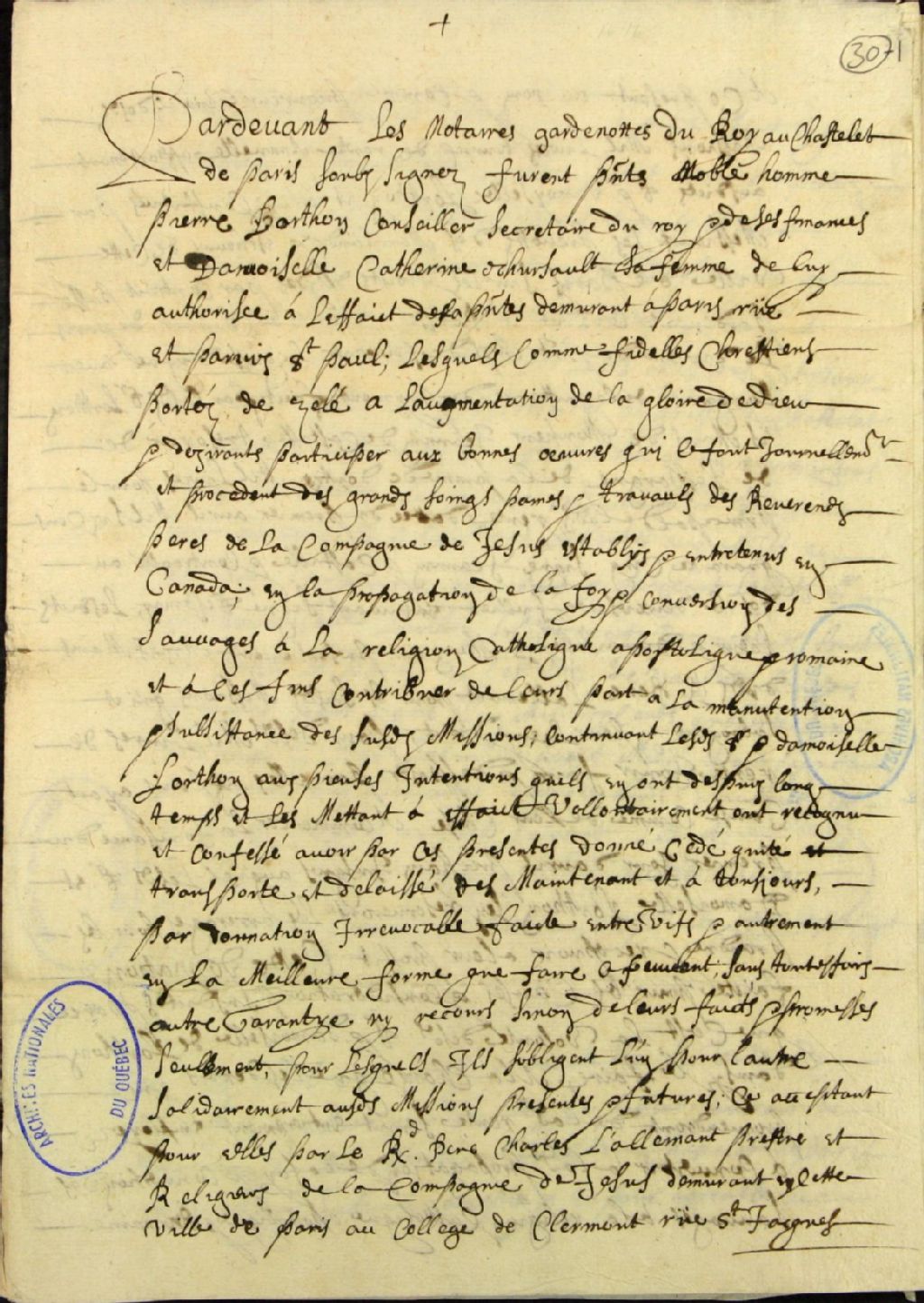 Donation entre vifs de mille livres tournois de rente annuelle, pour la propagation de la Foi et la conversion des Sauvages à la religion catholique, apostolique et romaine, par le noble homme Pierre Lorthon (Lorton), conseiller-secrétaire du Roi et de ses finances, et par damoiselle Catherine Dehursault, sa femme, demeurant dans la rue et paroisse de Saint-Paul à Paris, aux Révérends Pères de la Compagnie de Jésus établis au Canada, acceptant pour eux le Révérend Père Charles Lalemant, prêtre et Religieux de ladite Compagnie, demeurant au collège de Clermont, sur la rue Saint-Jacques à Paris, comme procureur général des missions de ladite Compagnie, par-devant Pacque et Gaultier (Gauthier), notaires et garde-notes du Roi en son Châtelet de Paris