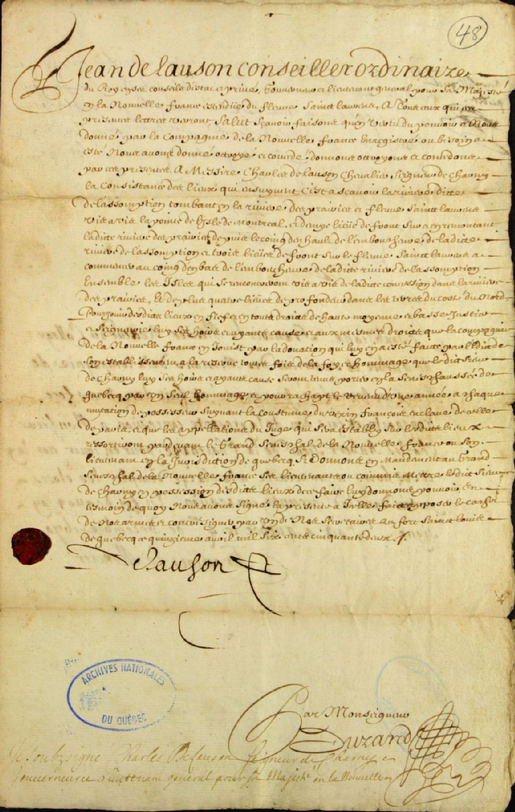 Acte de concession de terres situées à la rivière dite de l'Assomption, tombant dans la rivière des Prairies et dans le fleuve Saint-Laurent vis-à-vis de la pointe de l'île de Montréal, par Jean de Lauson (Lauzon), conseiller ordinaire du Roi en ses conseils d'État et privé, gouverneur et lieutenant général pour Sa Majesté en Nouvelle-France, à messire Charles de Lauson (Lauzon), chevalier, seigneur de Charny (15 avril 1652), donation et transport de ladite concession par ledit sieur Charles de Lauson (Lauzon) en faveur des Révérends Pères Jésuites du collège de Québec (10 septembre 1657), et donation et transport de ladite concession par François Lemercier, recteur du collège de Québec et supérieur des missions de la Compagnie de Jésus, en faveur de monsieur Charles Aubert de LaChesnaye (4 décembre 1670)