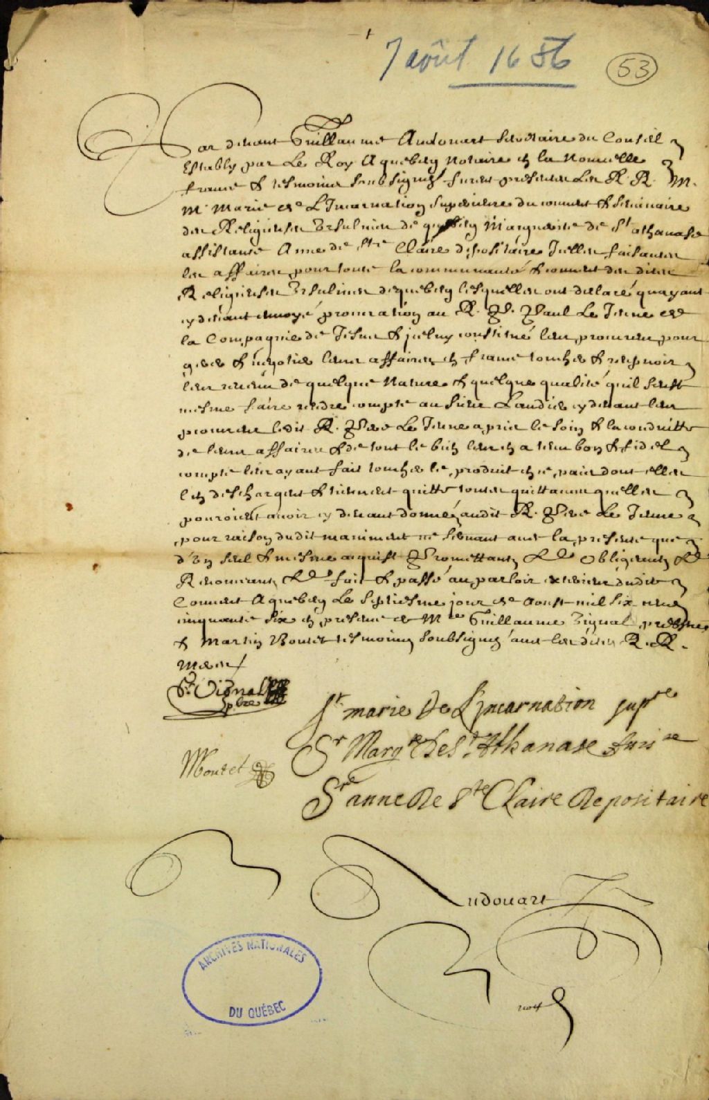 Quittance des Révérendes Mères Marie de l'Incarnation, supérieure du couvent et séminaire des Religieuses Ursulines de Québec, Marguerite de Sainte-Athanase, assistante, et Anne de Sainte-Claire, dépositaire, faisant pour toute la communauté desdites Religieuses Ursulines, en faveur du Révérend Père Paul Le Jeune (Lejeune), de la Compagnie de Jésus, leur procureur, par-devant Guillaume Audouart, secrétaire du Conseil établi par le Roi à Québec, notaire en la Nouvelle-France, Guillaume Vignal, prêtre, et Martin Boutet, témoins
