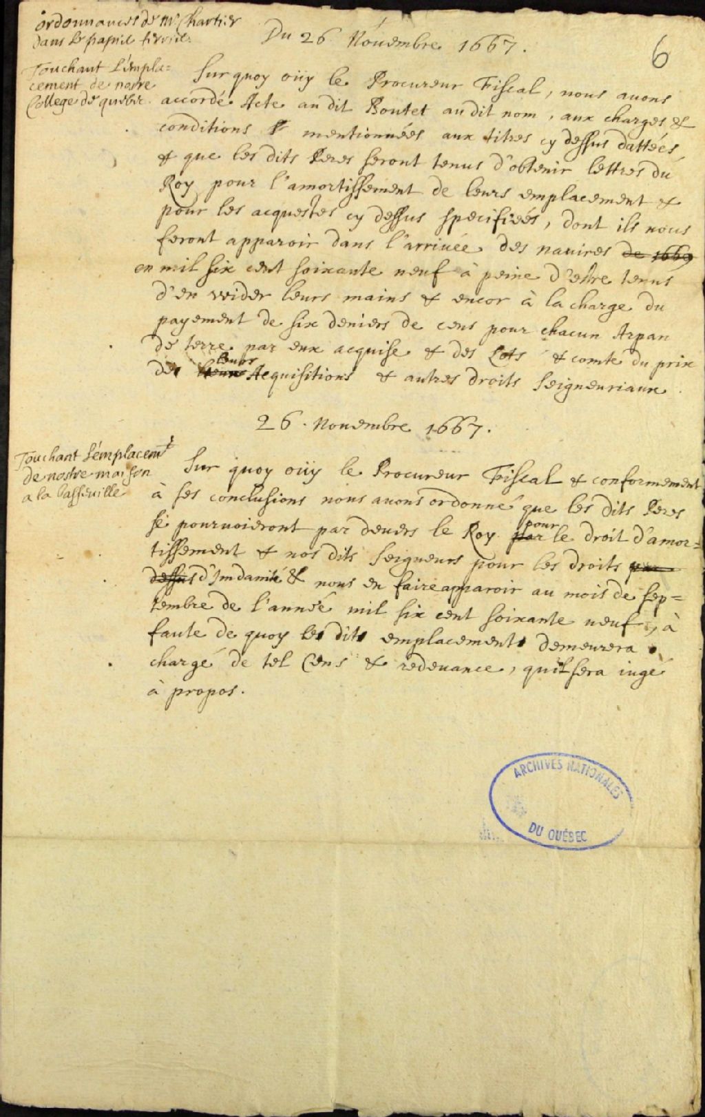 Copie des ordonnances de monsieur Chartier dans le papier terrier, touchant les titres et droits d'indemnité et d'amortissement de l'emplacement du collège des Révérends Pères Jésuites à Québec, de l'emplacement de la maison desdits Révérends Pères Jésuites en la Basse-Ville de Québec, de l'Île aux Ruaux (Île au Ruau), du fief sis à la rivière de l'Assomption, des terres sises aux rivières Batiscan et Champlain, de la seigneurie de Notre-Dame-des-Anges, de l'Île Jésus, de la Prairie-de-la-Madeleine et d'autres lieux, tous concédés auxdits Révérends Pères Jésuites, 26 novembre 1667 - 1er décembre 1667, Archives nationales à Québec, Fonds Ministère des Terres et Forêts, (03Q,E21,S64,SS5,SSS1,D6).