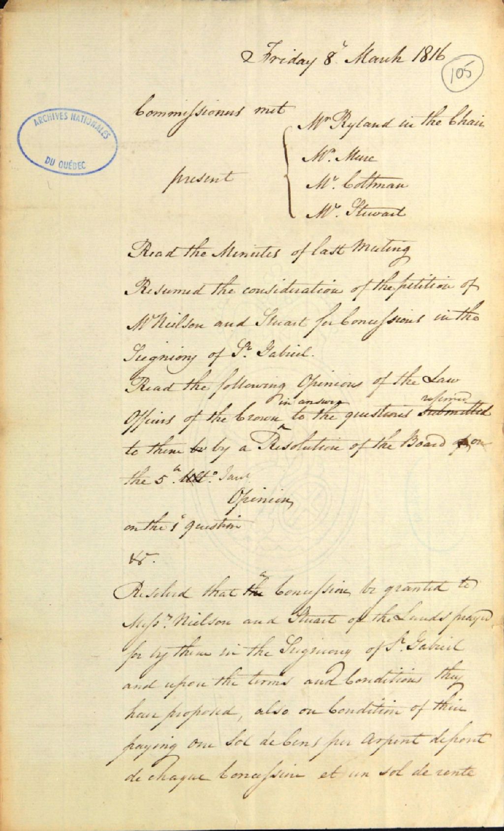 Brouillon d'un procès-verbal d'une réunion de la commission responsable de l'administration des biens des Jésuites, au sujet de concessions accordées à [John] Neilson et [Andrew] Stewart; au sujet de la nomination de [Charles] Voyer, notaire, et de J. Plante, pour constituer un papier-terrier des biens des Jésuites; au sujet de la coupe de pins par Thomas Coffin, sur des terres non concédées, dans la seigneurie de Cap Magdalin (Cap-de-la-Madeleine); où l'opinion des officiers de loi de la Couronne est lue, à propos de la ferme de Notre Dame des Anges (Notre-Dame-des-Anges); au sujet de l'état du moulin de Batiscan, 8 mars 1816, Archives nationales à Québec, Fonds Ministère des Terres et Forêts, (03Q,E21,S64,SS5,SSS2,D105).