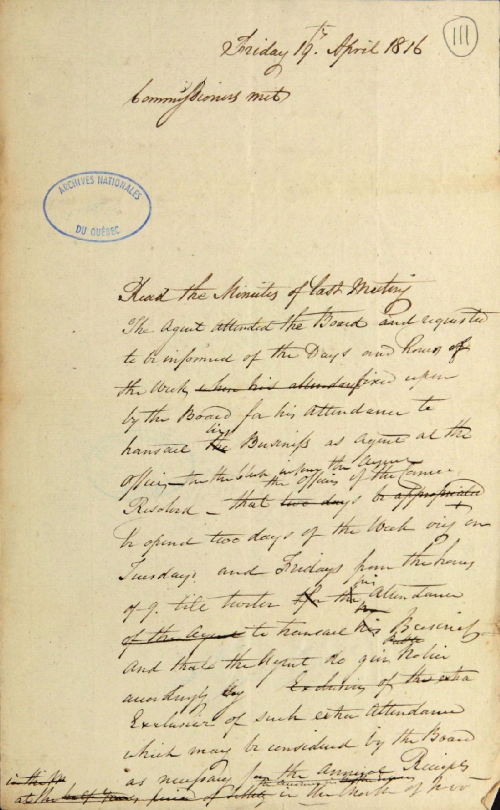 Brouillon d'un procès-verbal d'une réunion de la commission responsable de l'administration des biens des Jésuites, au sujet de l'ouverture de la commission au public; au sujet de la révocation de Plante (Joseph-Bernard Planté), notaire, de son poste pour l'amélioration du papier-terrier pour les biens des Jésuites et de son remplacement par Voyer; au sujet de changements concernant la concession accordée à [John] Neilson et [Andrew] Stuart, 19 avril 1816, Archives nationales à Québec, Fonds Ministère des Terres et Forêts, (03Q,E21,S64,SS5,SSS2,D111).
