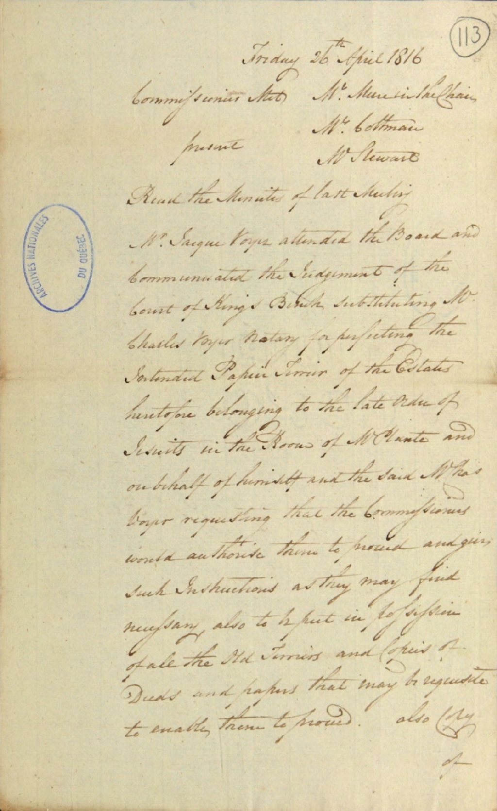 Brouillon d'un procès-verbal d'une réunion de la commission responsable de l'administration des biens des Jésuites, au sujet de la révocation de Plante (Joseph-Bernard Planté), notaire, de son poste pour l'amélioration du papier-terrier pour les biens des Jésuites et de son remplacement par Charles Voyer, lui-même remplacé dans ses anciennes fonctions par Jacques Voyer; au sujet de la concession accordée à [John] Neilson et [Andrew] Stuart, 26 avril 1816, Archives nationales à Québec, Fonds Ministère des Terres et Forêts, (03Q,E21,S64,SS5,SSS2,D113).