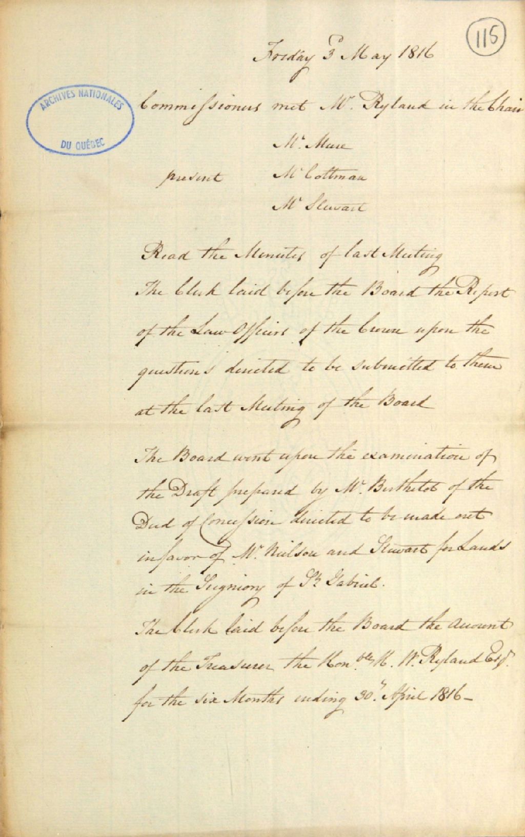 Brouillon d'un procès-verbal d'une réunion de la commission responsable de l'administration des biens des Jésuites, au sujet de la révocation de Joseph-Bernard Planté, notaire, de son poste pour l'amélioration du papier-terrier pour les biens des Jésuites et de son remplacement par Charles Voyer; au sujet de la concession accordée à [John] Neilson et [Andrew] Stuart; au sujet des comptes du trésorier [Herman Witsius] Ryland, 3 mai 1816, Archives nationales à Québec, Fonds Ministère des Terres et Forêts, (03Q,E21,S64,SS5,SSS2,D115).