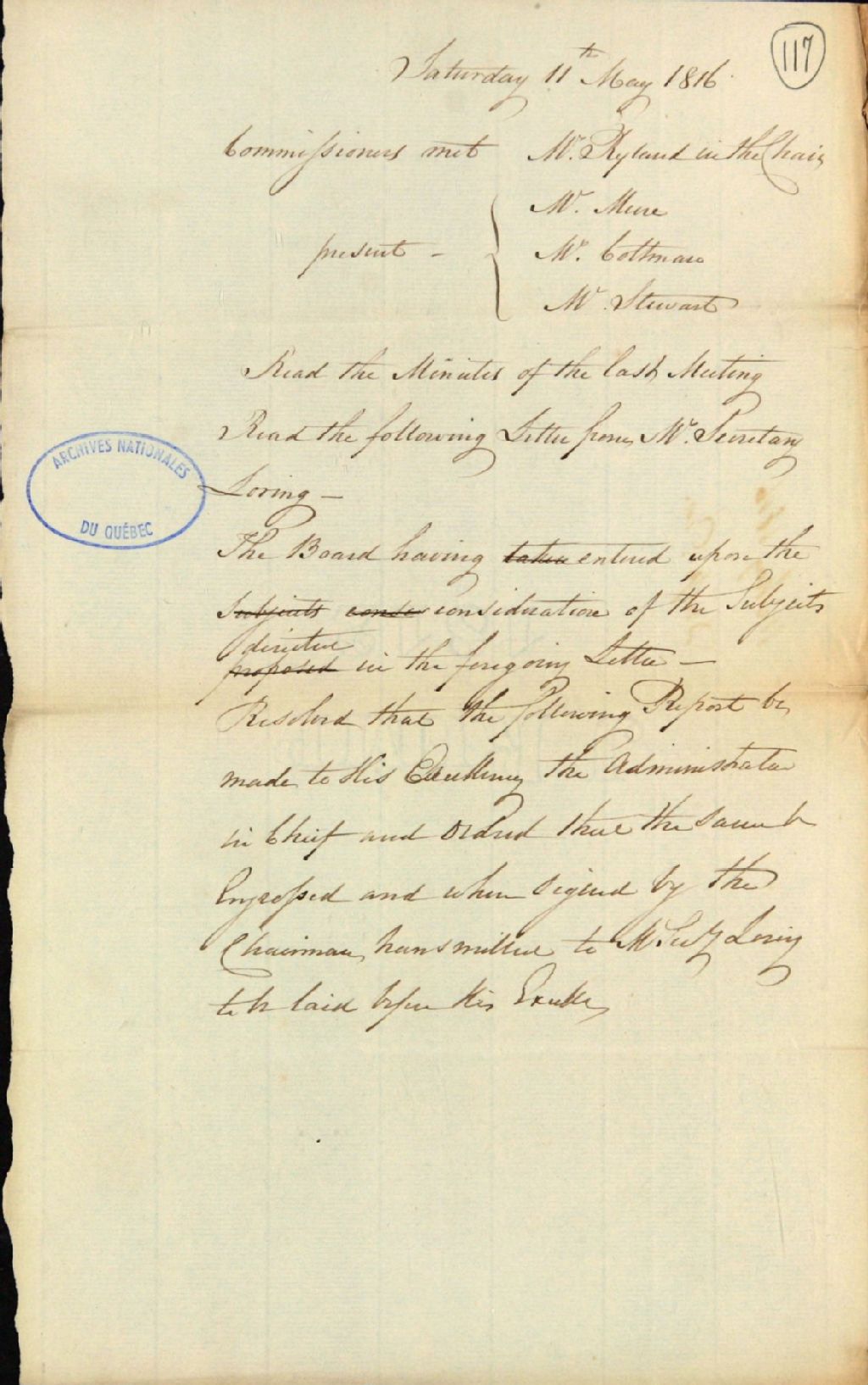 Brouillon d'un procès-verbal d'une réunion de la commission responsable de l'administration des biens des Jésuites, au sujet d'une lettre du secrétaire personnel du gouverneur, [Robert Roberts] Loring, 11 mai 1816, Archives nationales à Québec, Fonds Ministère des Terres et Forêts, (03Q,E21,S64,SS5,SSS2,D117).