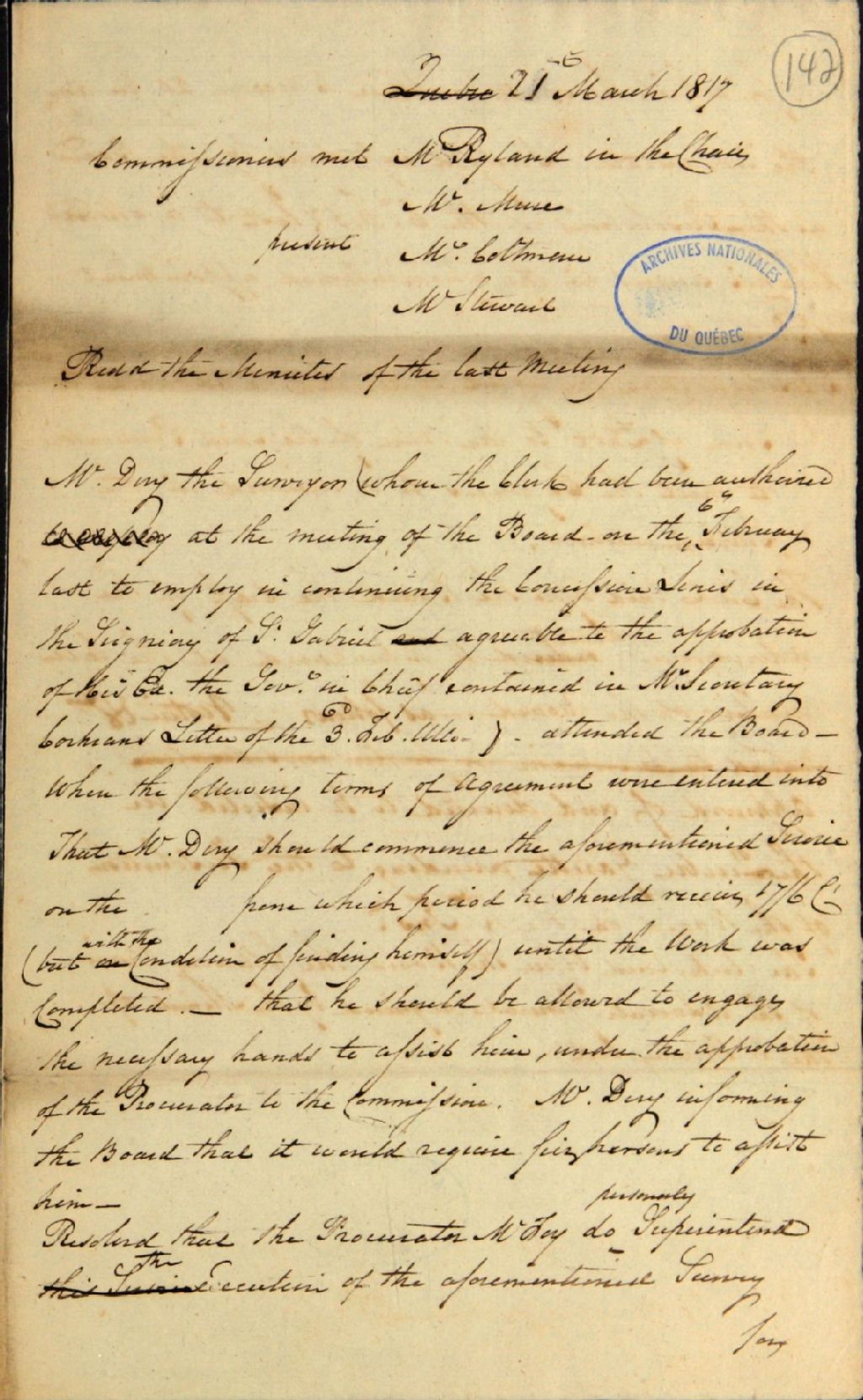 Brouillon d'un procès-verbal d'une réunion de la commission responsable de l'administration des biens des Jésuites, au sujet de la nomination de [Pierre] Déry, comme arpenteur pour l'arpentage de la seigneurie de Saint-Gabriel; au sujet de la nomination du procurateur (Lewis Foy) comme superviseur dudit arpentage; au sujet du brouillon de l'annonce à être faite pour offrir le bail du moulin de Notre-Dame-des-Anges, 21 mars 1817, Archives nationales à Québec, Fonds Ministère des Terres et Forêts, (03Q,E21,S64,SS5,SSS2,D142).