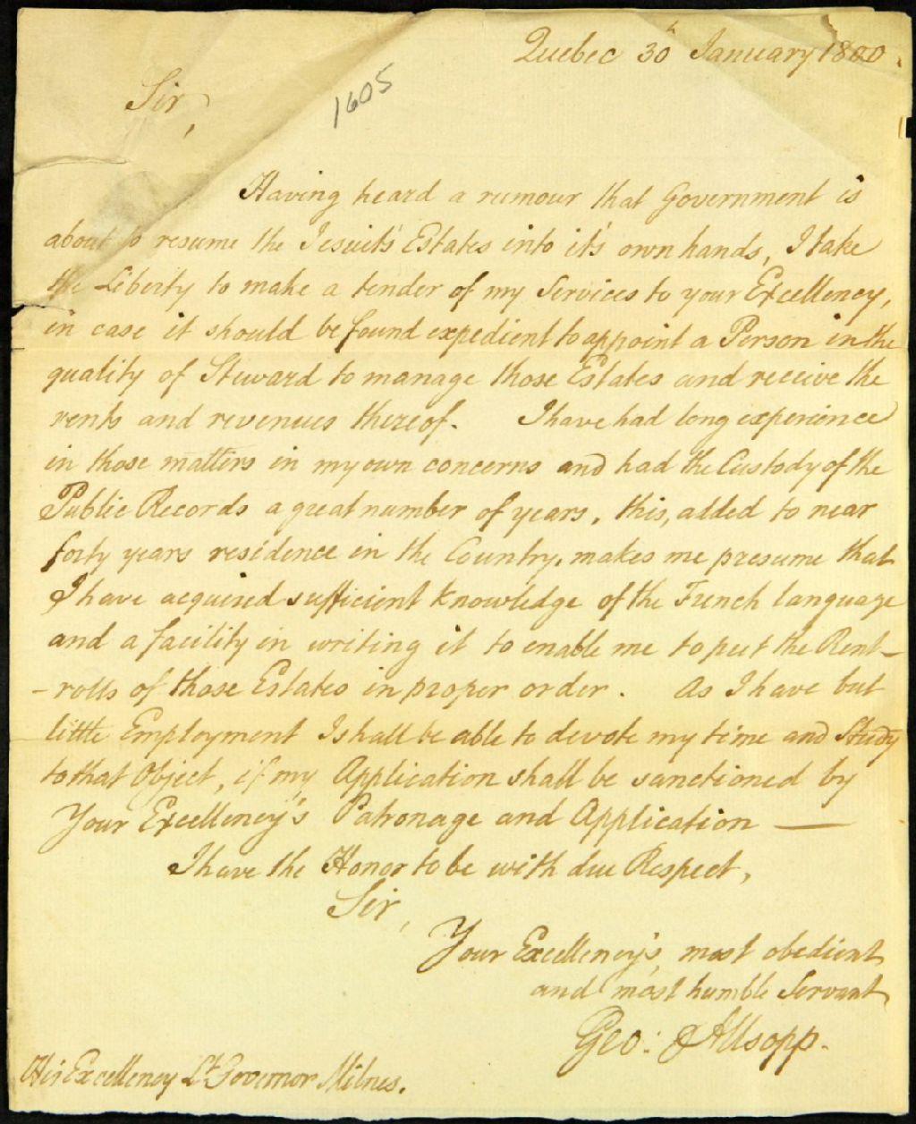 Requête d'Allsopp adressée à Son Excellence, Robert Shore Milnes, lieutenant-gouverneur du Bas-Canada; Allsopp a eu vent que les terres des Jésuites seraient reprises par le gouvernement et il offre de mettre son expérience à profit comme commissaire pour l'administration des biens des Jésuites, 30 janvier 1800, Archives nationales à Québec, Fonds Ministère des Terres et Forêts, (03Q,E21,S64,SS5,SSS2,D1605).