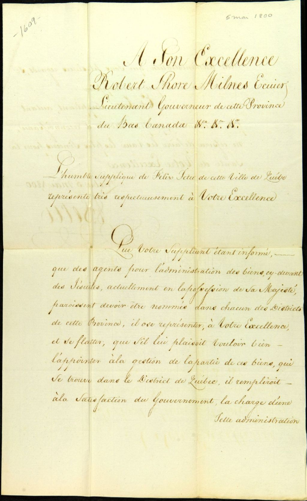 Requête de Félix Tetu (Têtu) adressée à Son Excellence Robert Shore Milnes, lieutenant-gouverneur du Bas-Canada. Tetu offre ses services comme agent des biens des Jésuites dans le District de Québec, 5 mai 1800, Archives nationales à Québec, Fonds Ministère des Terres et Forêts, (03Q,E21,S64,SS5,SSS2,D1609).