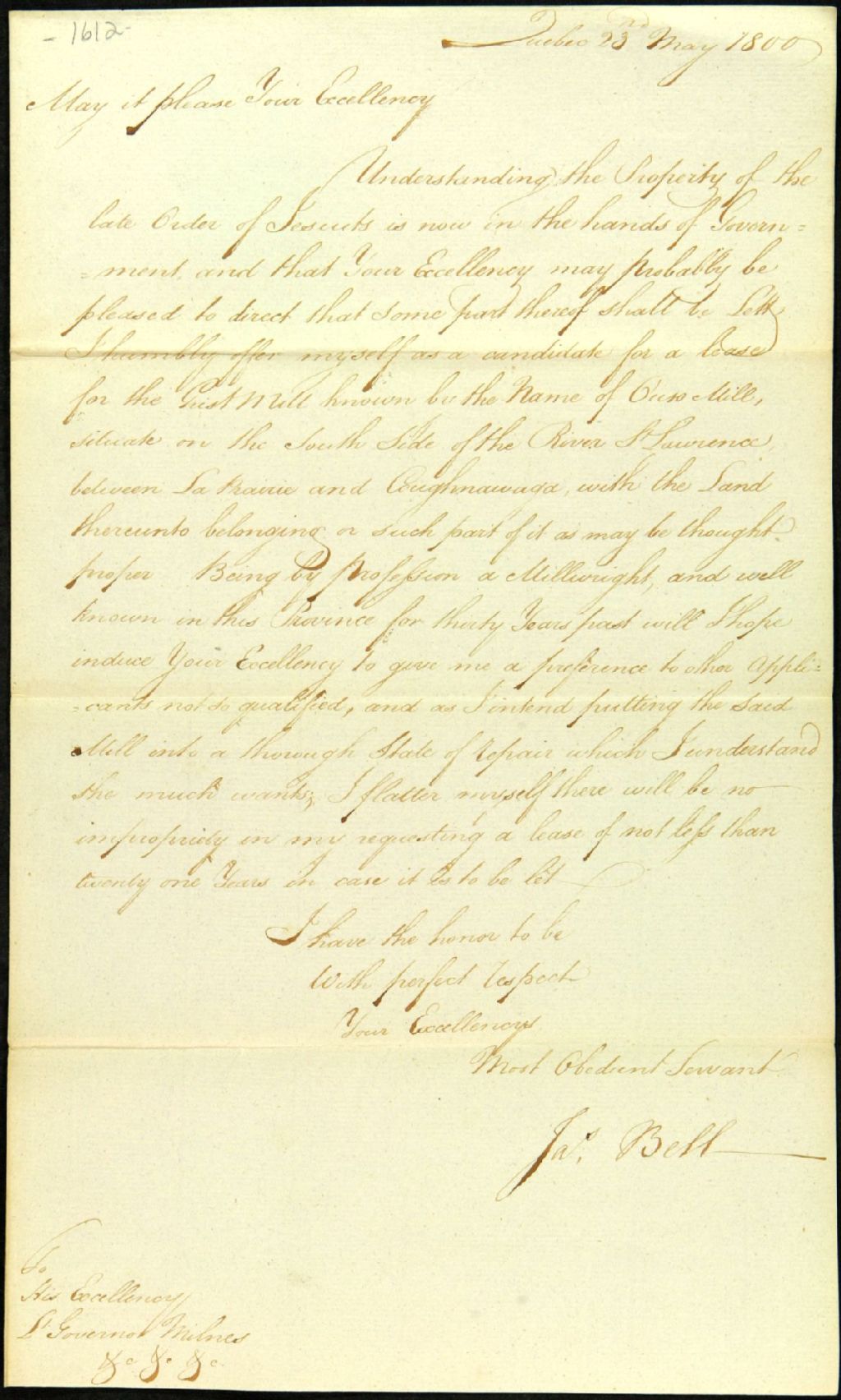 Requête de Jas Bell adressée à Son Excellence Robert Shore Milnes, lieutenant-gouverneur du Bas-Canada. Demande pour obtenir un bail à ferme de vingt-et-un-an pour un moulin à blé, nommé Ouso (?) Mill, érigé sur l'ancienne propriété du défunt Ordre des Jésuites située du côté Sud du fleuve Saint-Laurent entre Prairie-de-la-Madeleine et Caghnawaga (Kahnawake), 23 mai 1800, Archives nationales à Québec, Fonds Ministère des Terres et Forêts, (03Q,E21,S64,SS5,SSS2,D1612).