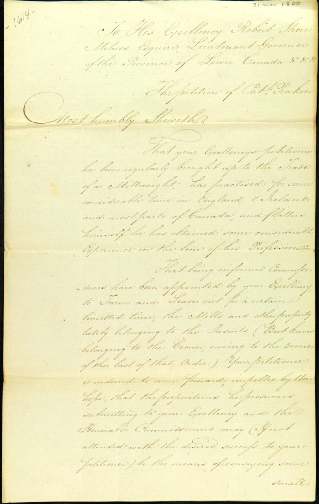 - Requête de Patrick Peakin adressée à Son Excellence Robert Shore Milnes, lieutenant-gouverneur du Bas-Canada, lui réclamant la location de moulins situés sur les biens des Jésuites