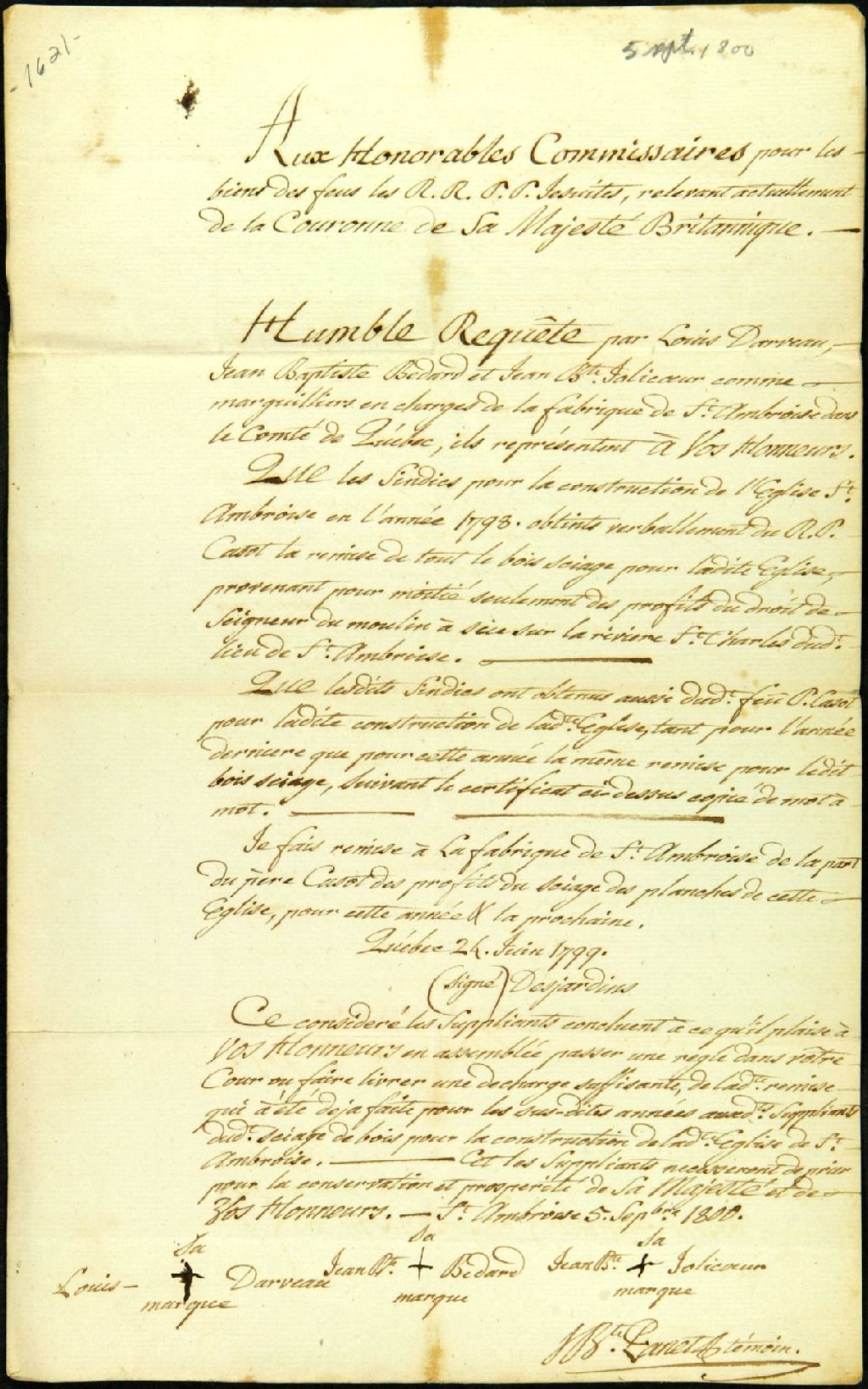 Requête de Louis Darreau, Jean-Baptiste Bédard et Jean-Baptiste Jolicoeur, marguilliers en charge de la fabrique de la paroisse de Saint-Ambroise, adressée aux Commissaires de la Commission responsable de l'administration des biens des Jésuites. Les marguilliers désirent obtenir la remise promise par le Révérend Père Casot quant aux profits du sciage des planches prévues pour la construction de l'église de la paroisse de Saint-Ambroise, 5 septembre 1800, Archives nationales à Québec, Fonds Ministère des Terres et Forêts, (03Q,E21,S64,SS5,SSS2,D1621).