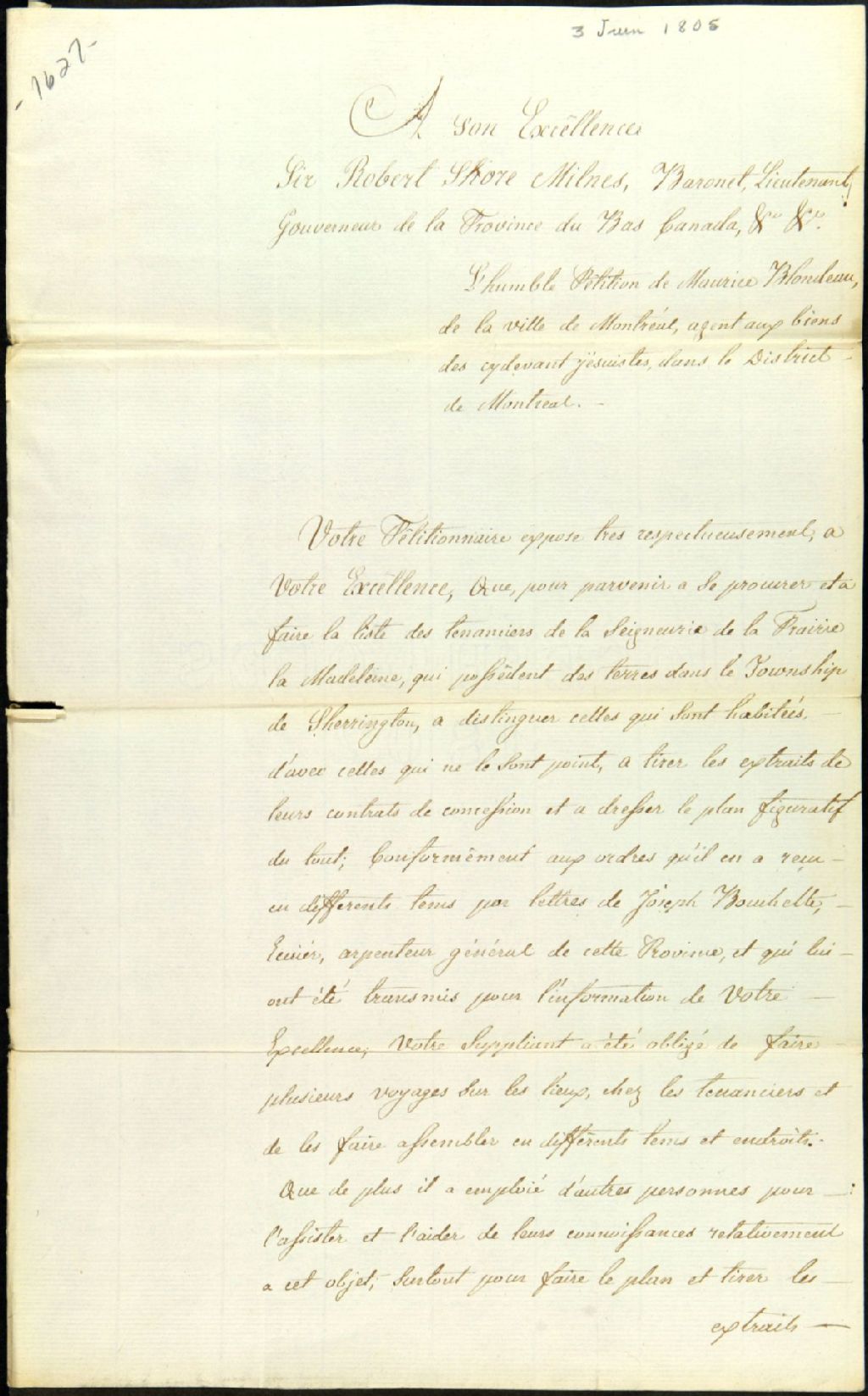 - Requête de Maurice [Régis] Blondeau, agent responsable des biens des Jésuites pour le District de Montréal, adressée à Son Excellence Robert Shore Milnes, lieutenant-gouverneur du Bas-Canada. Au sujet des frais encourus par Maurice [Régis] Blondeau pour la confection d'une liste des censitaires de la seigneurie de La Prairie-de-la-Madeleine possédant des terres dans le canton de Sherrington, et ce, conformément aux ordres qu'il a reçus par lettres de Joseph Bouchette, arpenteur général de la province