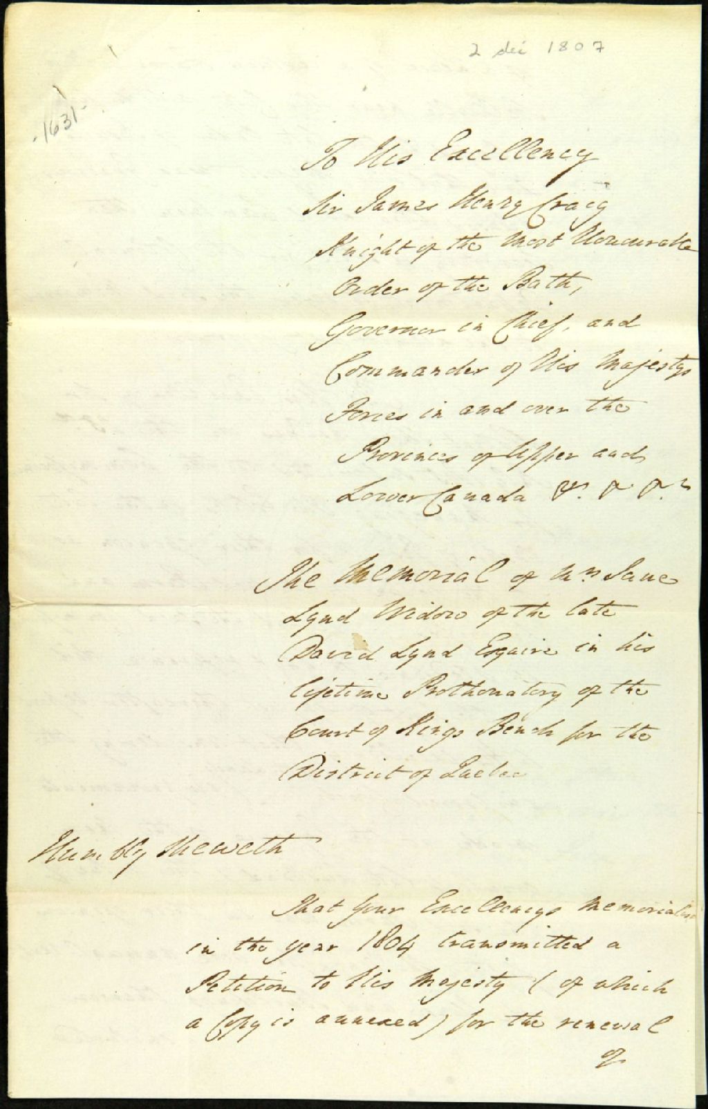 - Requête de madame Jane Lynd (Jane Henry), veuve de David Lynd, adressée au gouverneur James Henry Craig; afin d'obtenir un bail pour la ferme de Belleville