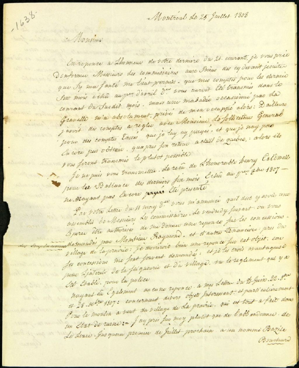 Lettre de Maurice [Régis] Blondeau, agent responsable des biens des Jésuites [pour le district de Montréal], adressée à George Pyke, secrétaire de la commission responsable de l'administration des biens des Jésuites. Concerne divers objets: au sujet du retard dans la remise des comptes de Blondeau, atteint de la gravelle; au sujet du reçu de l'honorable Henry Caldwell qui n'a pas encore été présenté; au sujet de la décision qui sera prise par les commissaires quant aux concessions situées près du village de la Prairie-de-la-Madeleine et, à cet effet, de la demande par monsieur Raymond au sujet de l'état de ruine du moulin à vent et de l'entente avec un certain Basile Bouchard chargé de le réparer; au sujet du renouvellement du bail du moulin à eau de la Prairie-de-la-Madeleine par monsieur James Dunn et, enfin, l'agent réclame une somme supplémentaire pour tout le travail qu'il a mis à constituer un registre contenant le dénombrement et le détail des droits, cens et rentes qui étaient dus dans son District, 25 juillet 1808, Archives nationales à Québec, Fonds Ministère des Terres et Forêts, (03Q,E21,S64,SS5,SSS2,D1638).