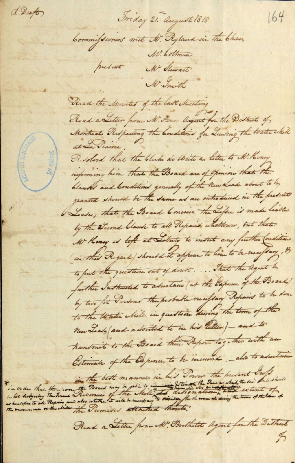 Brouillon d'un procès-verbal d'une réunion de la commission responsable de l'administration des biens des Jésuites, au sujet des obligations demandées pour le bail du moulin à eau de La Prairie; au sujet des conséquences de la mort de Louis Déry, meunier, sur le bail du moulin de Charlesbourg; au sujet des arrérages sur le cens et rentes et sur le lots et ventes des censitaires de l'Ancient Lorette (L'Ancienne-Lorette), dans la seigneurie de Saint-Gabriel, par [Michel] Berthelot, agent responsable des biens des Jésuites pour le district de Québec; au sujet du salaire du procurateur de ladite commission, [Lewis] Foy; au sujet de l'encombrement de la partie de la berge de la rivière Saint-Charles adjacente au pont Dorchester par des morceaux de bois, 21 août 1818, Archives nationales à Québec, Fonds Ministère des Terres et Forêts, (03Q,E21,S64,SS5,SSS2,D164).