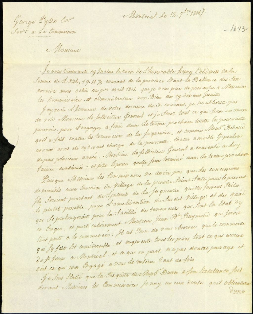 Lettre de Maurice [Régis] Blondeau, agent responsable des biens des Jésuites [pour le District de Montréal], adressée à George Pyke, secrétaire de la Commission responsable de l'administration des biens des Jésuites; au sujet des comptes de l'agent; au sujet des poursuites du solliciteur général, entre autres, contre Amable Gipoulou; au sujet des concessions demandées dans le village de la prairie (Laprairie, La Prairie), de la croissance du commerce dans ladite seigneurie et, conséquemment, d'un certain Jean-Baptiste Raymond qui s'offre à construire un quai. Enfin, au sujet d'une allouance (dédommagement) que demande Blondeau pour la gestion du terrier de son District
