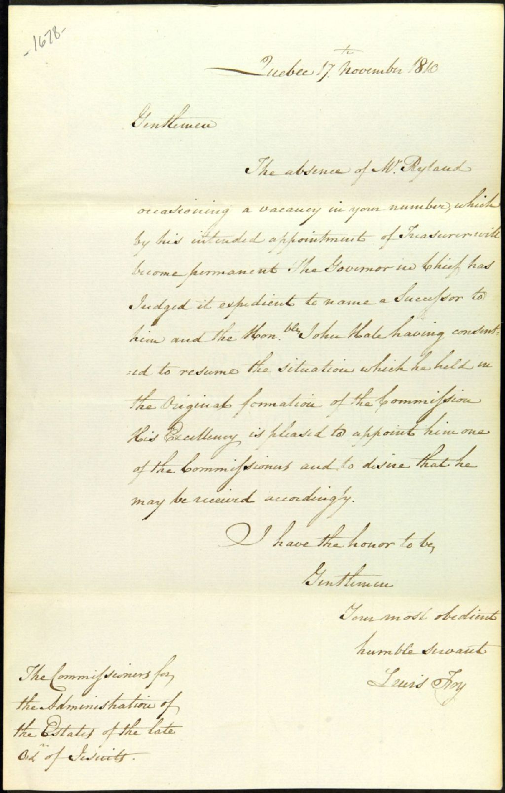 En l'absence de [Herman] W. [Witsius] Ryland, [secrétaire civil du gouverneur], lettre de Lewis [Louis] Foy, secrétaire intérimaire, adressée aux commissaires de la Commission responsable de l'administration des biens des Jésuites. Au sujet de la désignation de Ryland comme trésorier de ladite Commission et de son remplacement temporaire par John Hale, comme trésorier et comme commissaire, 17 novembre 1810, Archives nationales à Québec, Fonds Ministère des Terres et Forêts, (03Q,E21,S64,SS5,SSS2,D1678).
