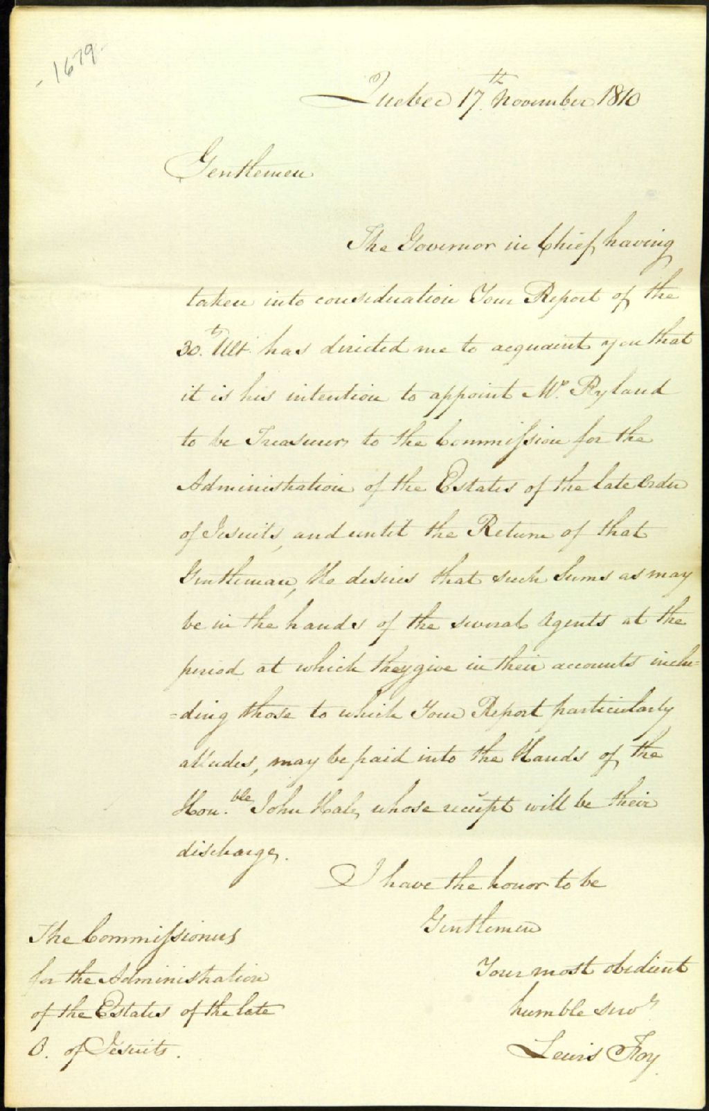 Lettre de Lewis [Louis] Foy, secrétaire intérimaire, adressée aux commissaires de la Commission responsable de l'administration des biens des Jésuites. Au sujet de la désignation de [Herman Witsius] Ryland comme trésorier de ladite Commission et de son remplacement temporaire par John Hale, comme trésorier et comme commissaire, 17 novembre 1810, Archives nationales à Québec, Fonds Ministère des Terres et Forêts, (03Q,E21,S64,SS5,SSS2,D1679).