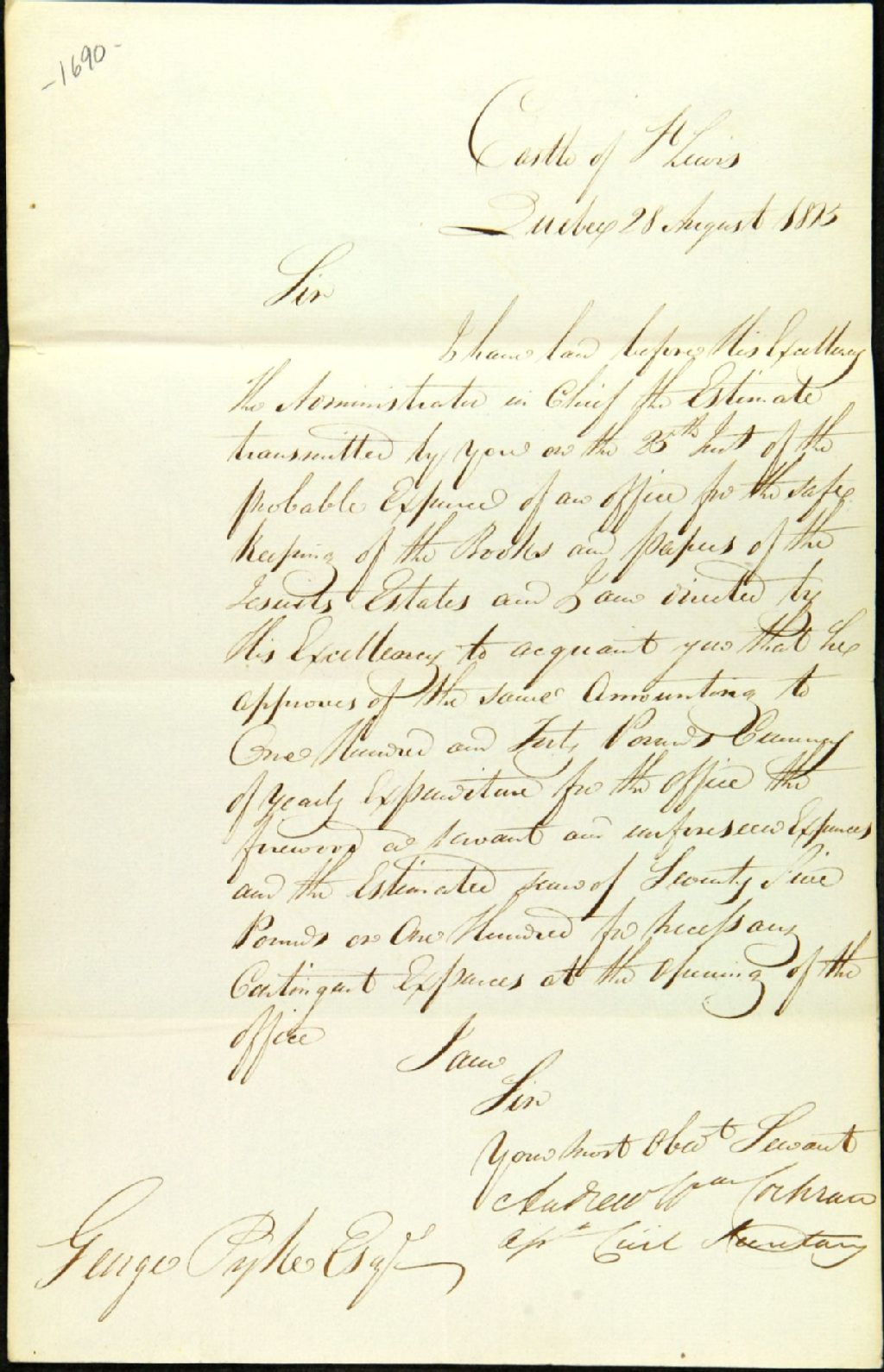 Andrew W. [William] Cochran, secrétaire civil du gouverneur, adressée à George Pyke, secrétaire de la Commission responsable de l'administration des biens des Jésuites, laquelle lettre a été rédigée au Château Saint-Louis. Le gouverneur approuve les estimés faits par les commissaires quant à la location d'un local pour y abriter les différents livres et autres documents de ladite Commission, 28 août 1815, Archives nationales à Québec, Fonds Ministère des Terres et Forêts, (03Q,E21,S64,SS5,SSS2,D1690).