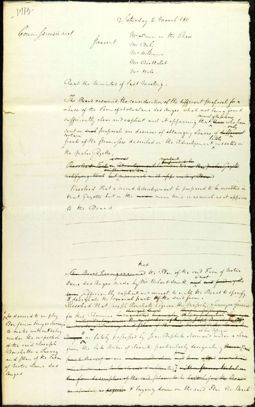 Brouillon du résumé d'une réunion de la Commission responsable de l'administration des biens des Jésuites; étaient présents messieurs: [Thomas] Dunn, [François] Baby, [Jenkin] Williams, [Michel] Berthelot, [John] Hale. Au sujet des offres reçues pour obtenir le bail de la ferme de Notre-Dame-des-Anges; au sujet d'une annonce à être faite pour offrir ledit bail au public; au sujet de la désignation de Benjamin Écuyer (L'Écuyer), sous le contrôle de Joseph Bouchette (arpenteur général), pour réaliser un arpentage et un plan de ladite ferme, 2 mars 1811, Archives nationales à Québec, Fonds Ministère des Terres et Forêts, (03Q,E21,S64,SS5,SSS2,D1713).