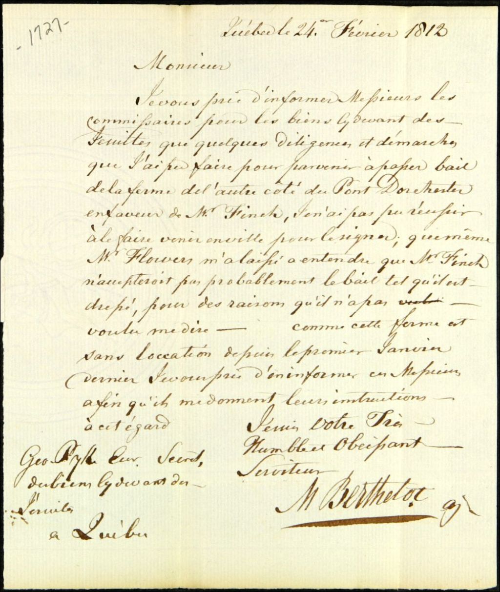 Lettre de [Michel] Berthelot [agent responsable des biens des Jésuites pour le District de Québec] adressée à George Pyke, secrétaire de la Commission responsable de l'administration des biens des Jésuites, au sujet du bail de la ferme près du pont Dorchester qui serait en faveur d'un certain [Samuel] Finch. Toutefois, un certain Flowers (?) aurait indiqué à l'agent que Finch n'accepterait probablement pas le bail tel qu'il est dressé, 24 février 1812, Archives nationales à Québec, Fonds Ministère des Terres et Forêts, (03Q,E21,S64,SS5,SSS2,D1727).