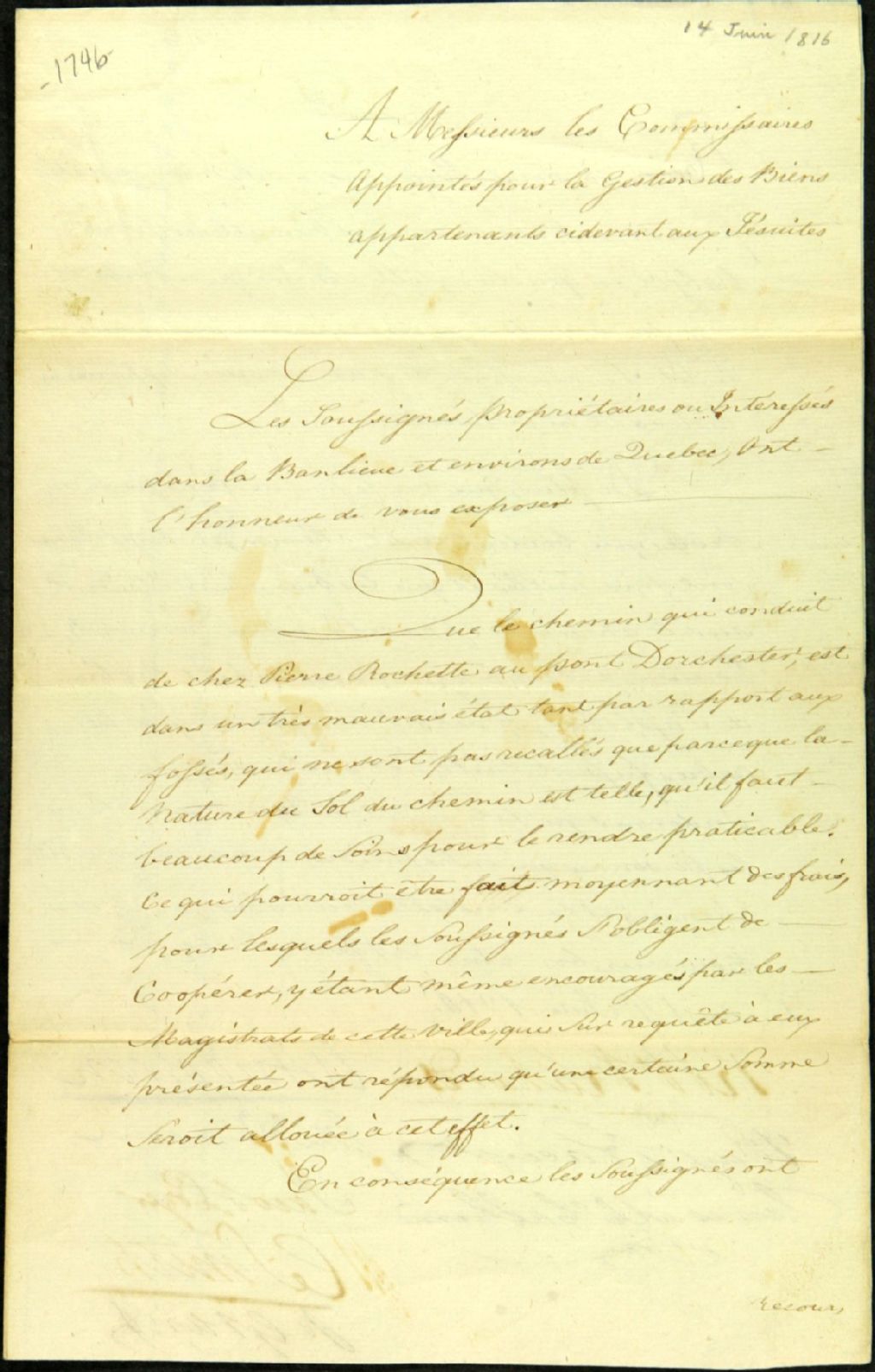 Requête de propriétaires ou d'intéressés (C. Smith, Jacob Pozer (Pfotzer), John Anderson, P. Grant, Robert Richardson), résidant dans la banlieue et les environs de Québec, adressée aux commissaires de la Commission responsable de l'administration des biens des Jésuites; ceux-ci demandent que leur soit allouée une somme pour la réparation du chemin Dorchester, 14 juin 1816, Archives nationales à Québec, Fonds Ministère des Terres et Forêts, (03Q,E21,S64,SS5,SSS2,D1746).