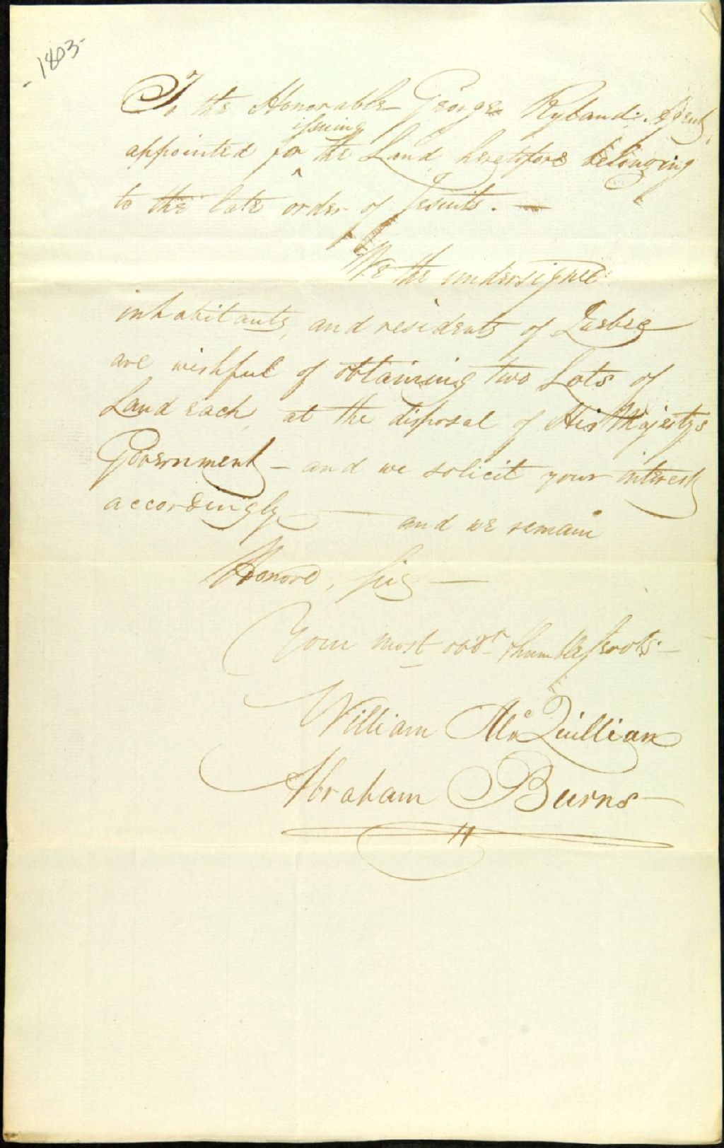 Requête de William McQuillian et d'Abraham Burns adressée à George [Herman] Ryland, secrétaire de la Commission responsable de l'administration des biens des Jésuites; pour obtenir deux lots de terre chacun, 1er janvier 1826- 31 décembre 1850, Archives nationales à Québec, Fonds Ministère des Terres et Forêts, (03Q,E21,S64,SS5,SSS2,D1803).