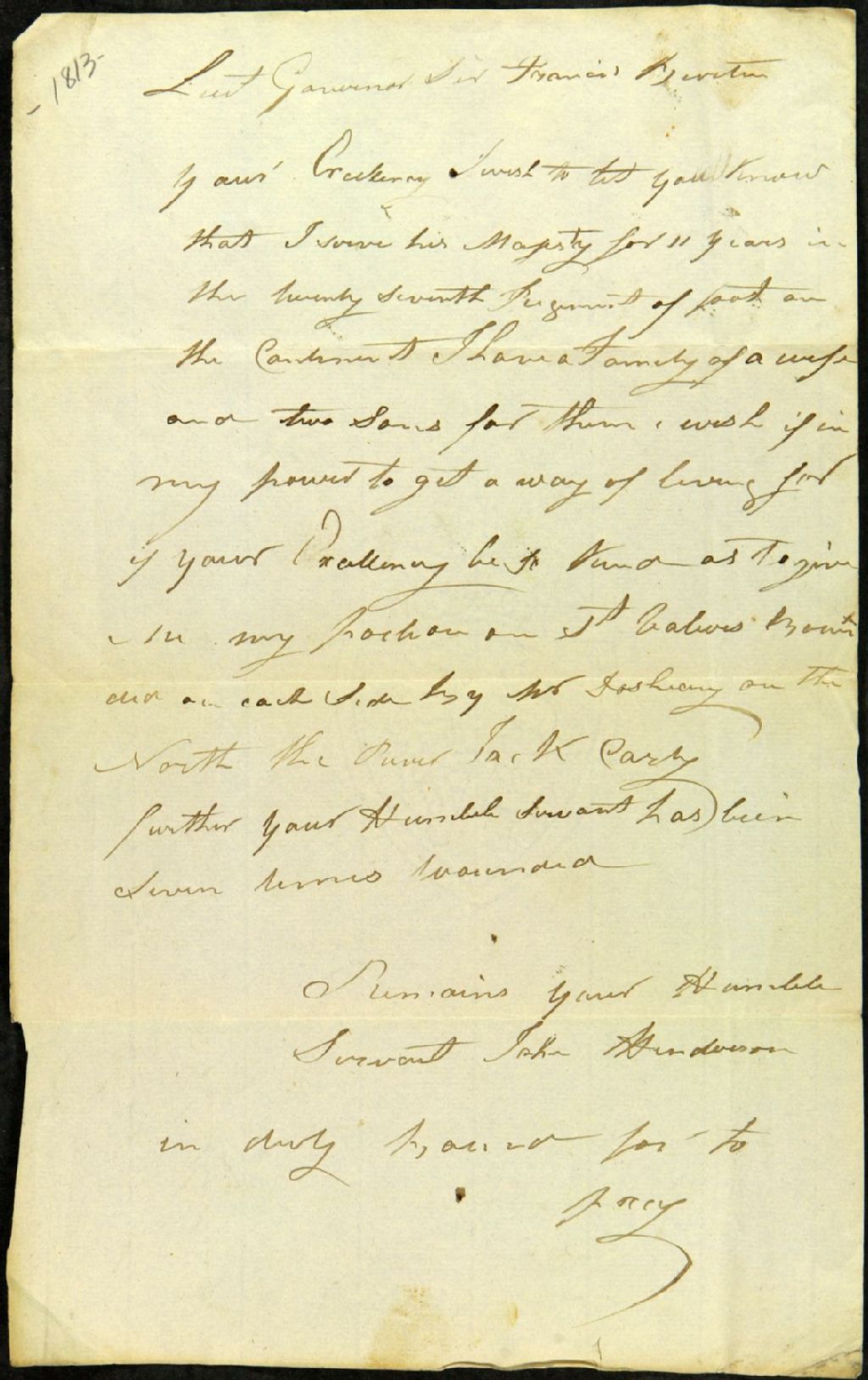 Requête de John Henderson adressée à Francis [Nathaniel] Burton, lieutenant-gouverneur; pour obtenir une terre au nord de la rivière Jack Carty (Jacques-Cartier), 1er janvier 1821- 31 décembre 1850, Archives nationales à Québec, Fonds Ministère des Terres et Forêts, (03Q,E21,S64,SS5,SSS2,D1813).