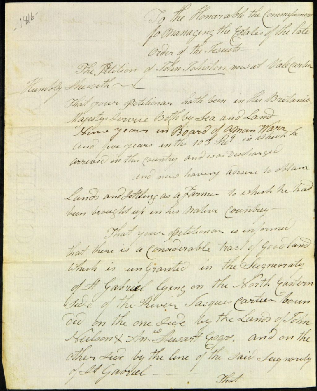 Requête de John Johnston adressée aux commissaires responsables de l'administration des biens des Jésuites. Johnston, soldat démobilisé, ayant servi neuf ans sur terre et mer à bord du «aman Warr» et cinq ans dans le 103e régiment, par lequel il est arrivé dans ce pays, fait une demande pour obtenir une bonne terre dans la seigneurie de Saint-Gabriel au nord-est de la rivière Jacques-Cartier; description dudit terrain et des plus proches voisins, 1er janvier 1821- 31 décembre 1850, Archives nationales à Québec, Fonds Ministère des Terres et Forêts, (03Q,E21,S64,SS5,SSS2,D1816).