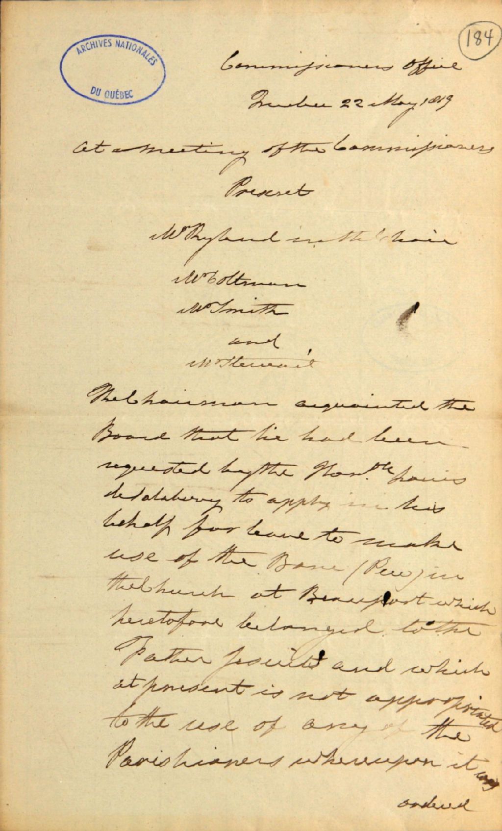 Brouillon d'un procès-verbal d'une réunion de la commission responsable de l'administration des biens des Jésuites, au sujet d'une requête d'[Ignace-Michel-Louis-Antoine D'Irumberry] de Salaberry concernant le banc d'église de l'église de Beauport ayant appartenu aux Jésuites; au sujet de l'octroi de concessions dans la seigneurie de Saint-Gabriel; au sujet des comptes d'[Edme] Henry, agent responsable des biens des Jésuites pour le district de Montréal, 22 mai 1819, Archives nationales à Québec, Fonds Ministère des Terres et Forêts, (03Q,E21,S64,SS5,SSS2,D184).