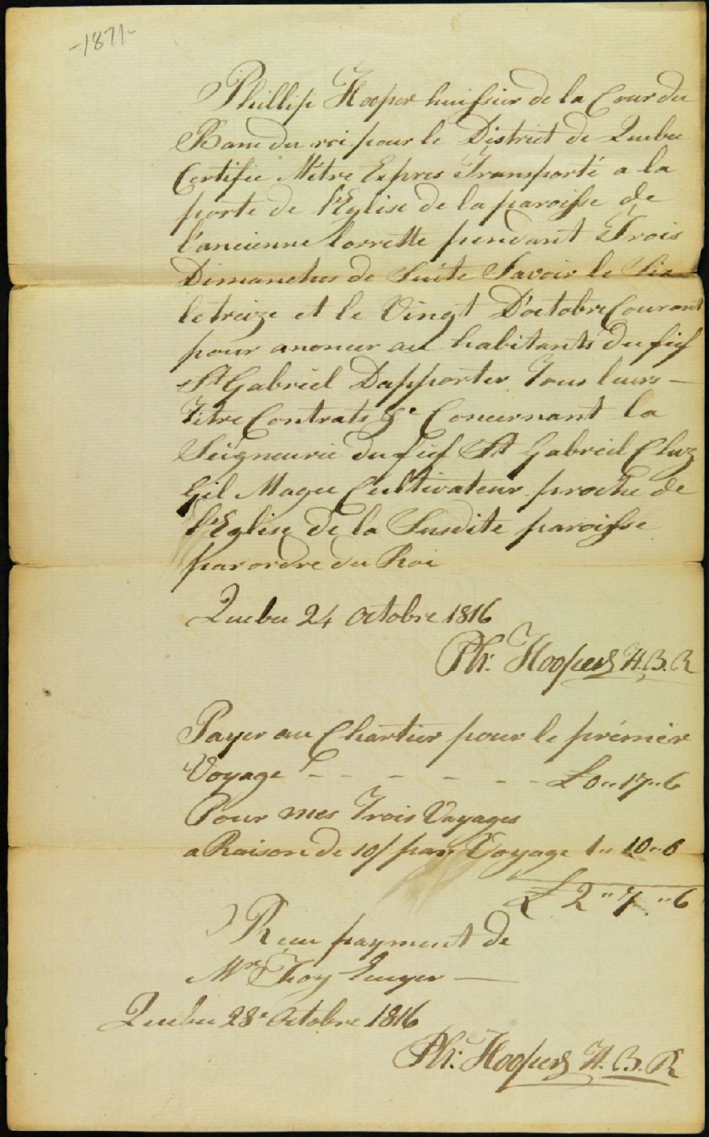 Reçu attestant le paiement d'une somme à Philippe Hoopers, huissier de la Cour du Banc du Roi pour le District de Québec, par Lewis [Louis] Foy, procureur des commissaires des biens des Jésuites, pour ses déplacements à l'église de la paroisse de L'Ancienne-Lorette pendant trois dimanches, et ce, pour annoncer aux habitants du fief Saint-Gabriel d'apporter tous les titres et les contrats concernant ladite seigneurie chez Gil (Gilles) Magee (Magui), cultivateur, proche de l'église de la dite paroisse, 24 octobre 1816, Archives nationales à Québec, Fonds Ministère des Terres et Forêts, (03Q,E21,S64,SS5,SSS2,D1871).