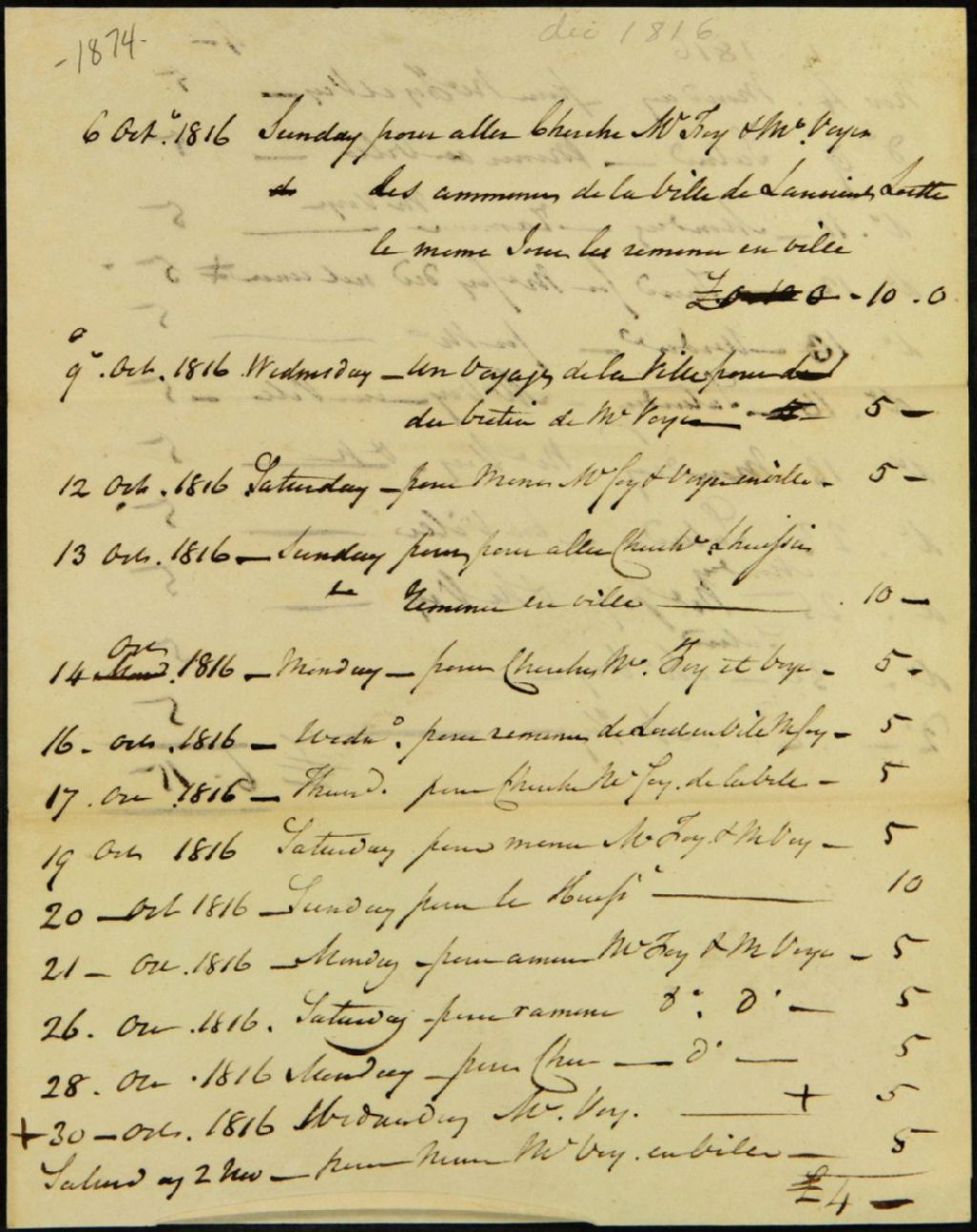 Compte pour être allé chercher monsieur Foy et monsieur Voyer de la ville jusqu'à L'Ancienne-Lorette et de ladite paroisse jusqu'à la ville, 6 octobre 1816, Archives nationales à Québec, Fonds Ministère des Terres et Forêts, (03Q,E21,S64,SS5,SSS2,D1874).