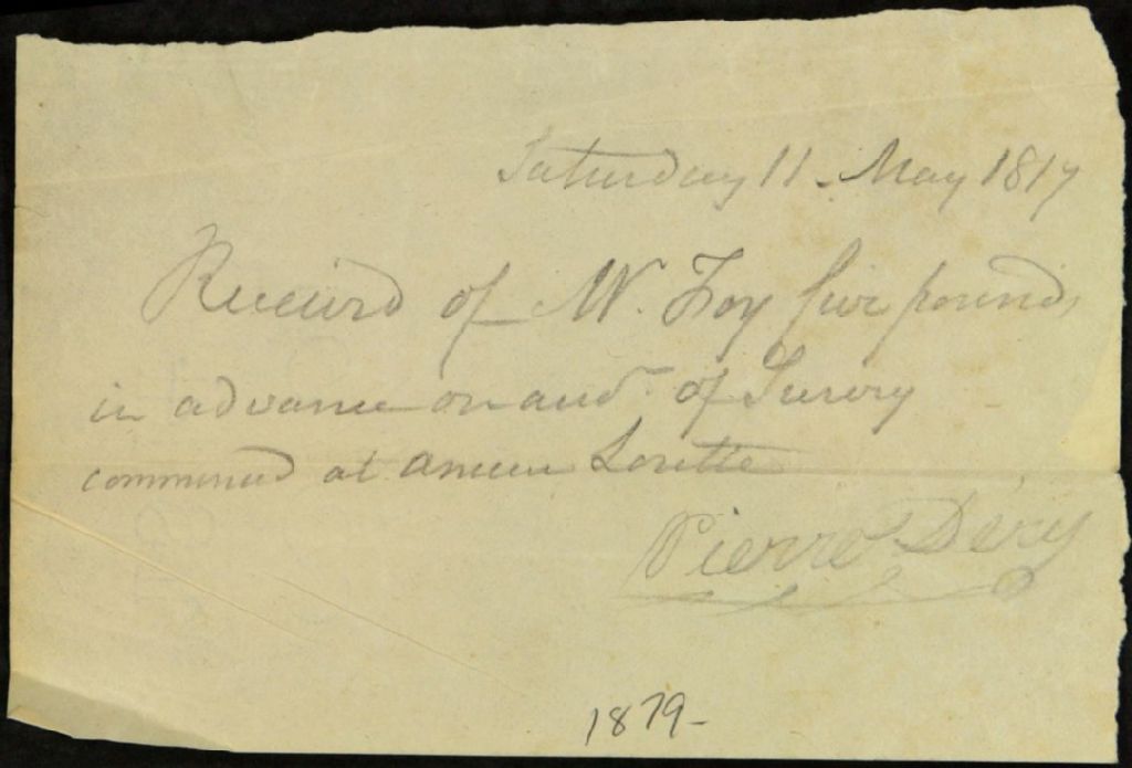 Reçu attestant le paiement d'une somme de cinq livres à Pierre Déry, arpenteur, par Lewis [Louis] Foy, [procureur pour les commissaires des biens des Jésuites], pour ses services à L'Ancienne-Lorette, 11 mai 1817, Archives nationales à Québec, Fonds Ministère des Terres et Forêts, (03Q,E21,S64,SS5,SSS2,D1879).
