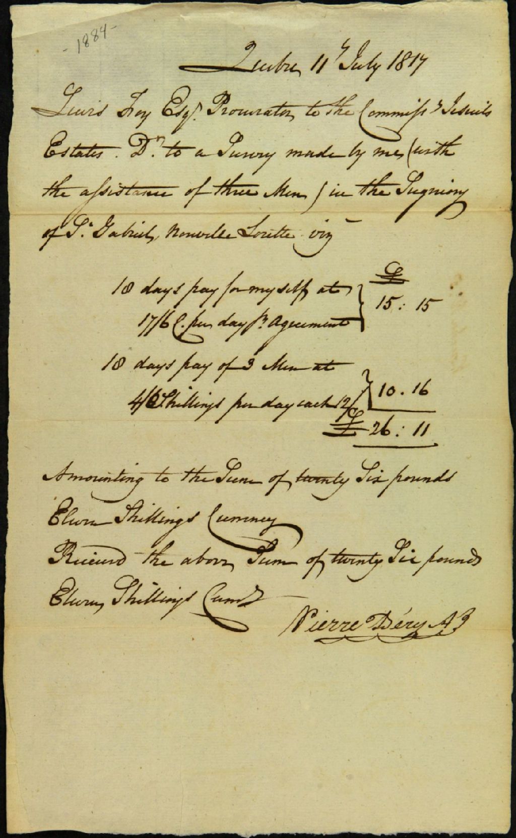 Reçu attestant le paiement d'une somme de 26 livres et 11 shillings, 4 shillings et 6 pences à Pierre Déry, arpenteur, par Lewis [Louis] Foy, procureur des commissaires des biens des Jésuites, pour son salaire ainsi que celui de trois autres hommes embauchés pour l'assister dans l'arpentage d'une partie de la seigneurie de Saint-Gabriel, nouvelle Lorette (Jeune-Lorette), 11 juillet 1817, Archives nationales à Québec, Fonds Ministère des Terres et Forêts, (03Q,E21,S64,SS5,SSS2,D1884).
