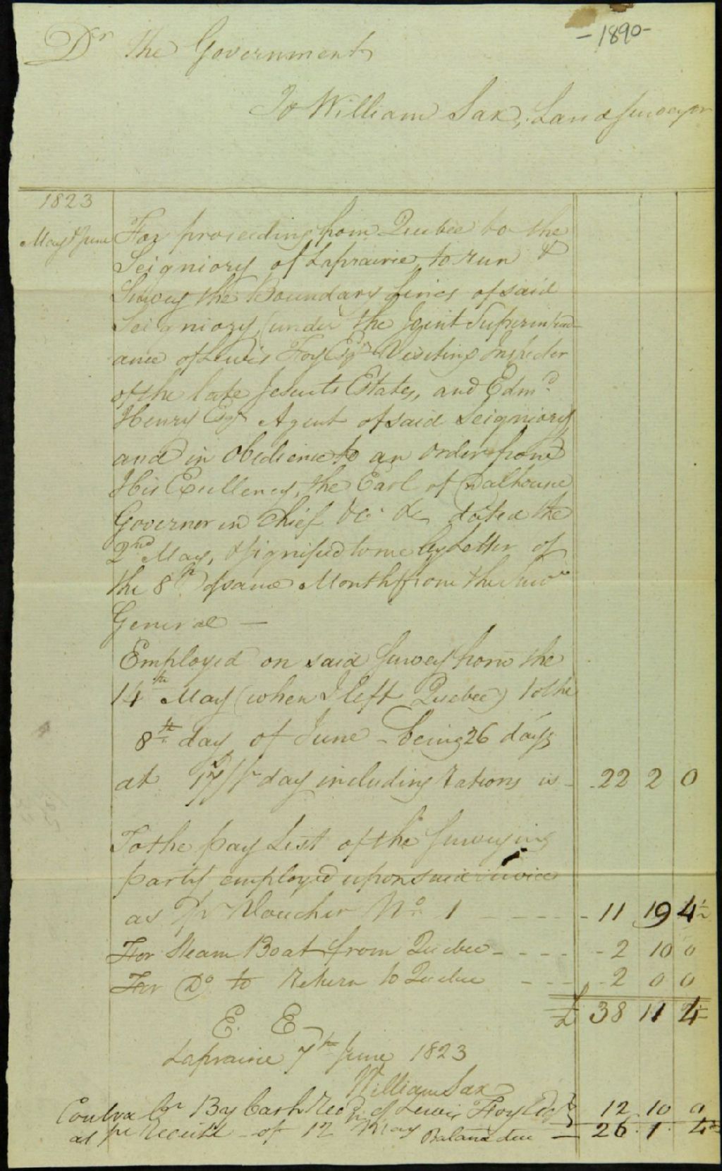 Reçu attestant le paiement d'une somme à William Sax, député arpenteur, par Edme Henry, agent dans la seigneurie de Laprairie, pour frais et salaire des journaliers et de lui-même qui ont retracé les lignes extérieures de la seigneurie de La Prairie-de-la Madeleine, 7 juin 1823, Archives nationales à Québec, Fonds Ministère des Terres et Forêts, (03Q,E21,S64,SS5,SSS2,D1890).