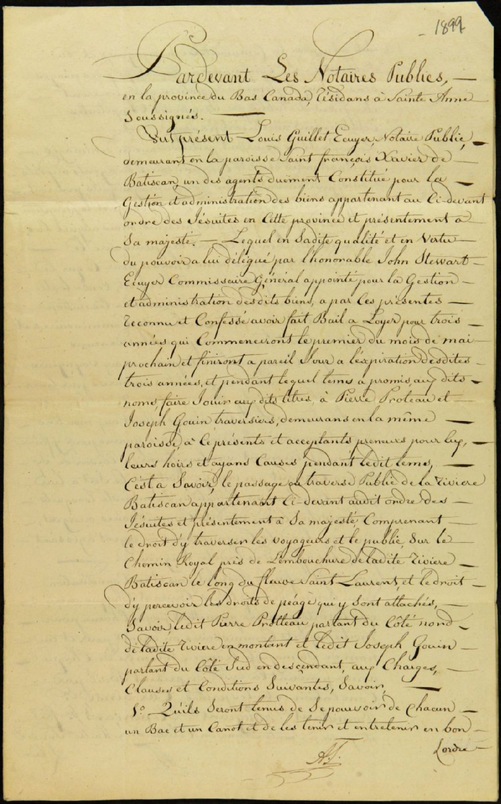 Bail de trois ans, pour les droits de passage et de péage sur la rivière Batiscan, accordé par monsieur Louis Guillet, notaire public et agent responsable des biens des Jésuites, aux sieurs Pierre Protteau (Proteau) et Joseph Gouin, traversiers demeurant en la paroisse de Saint-François-Xavier-de-Batiscan