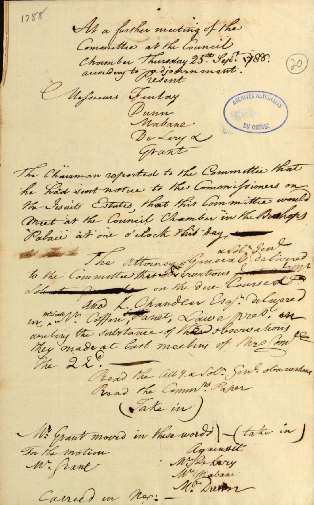Brouillon d'un procès-verbal d'une réunion du comité pour adopter une méthode pour amener à exécution l'ordre en Conseil de Sa Majesté (18 août 1786) en faveur de Lord Amherst (Jeffery, 1er baron d'Amherst; Jeffery Amherst), concernant une concession réclamée à même les biens des Jésuites, 25 septembre 1788, Archives nationales à Québec, Fonds Ministère des Terres et Forêts, (03Q,E21,S64,SS5,SSS2,D20).