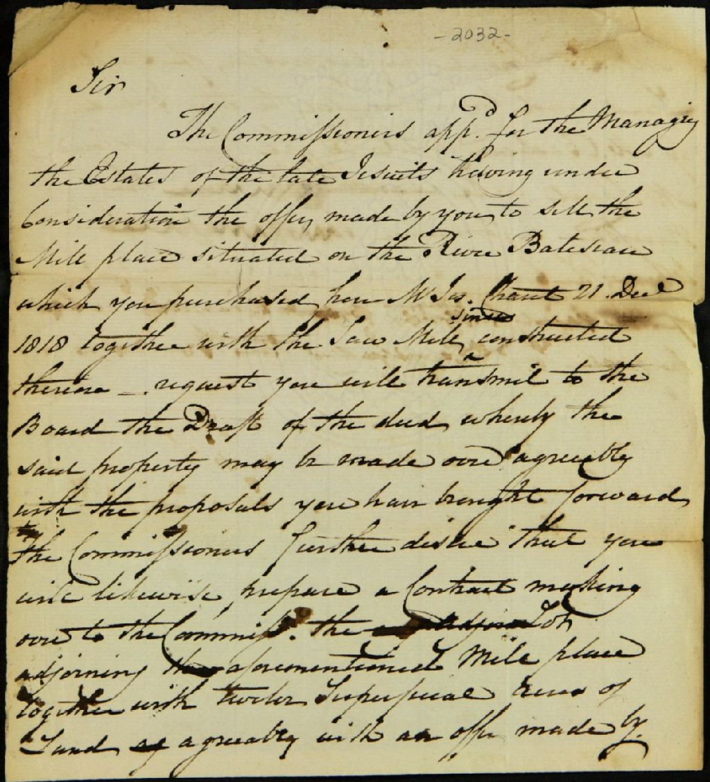Mot de réponse des commissaires responsables de l'administration des biens des Jésuites à une personne qui se propose acquéreur du moulin à scie situé sur la rivière Batiscan, lequel avait été acheté par monsieur Joseph Charet [Charest] le 21 décembre 1810, 1er janvier 1800-31 décembre 1849, Archives nationales à Québec, Fonds Ministère des Terres et Forêts, (03Q,E21,S64,SS5,SSS2,D2032).