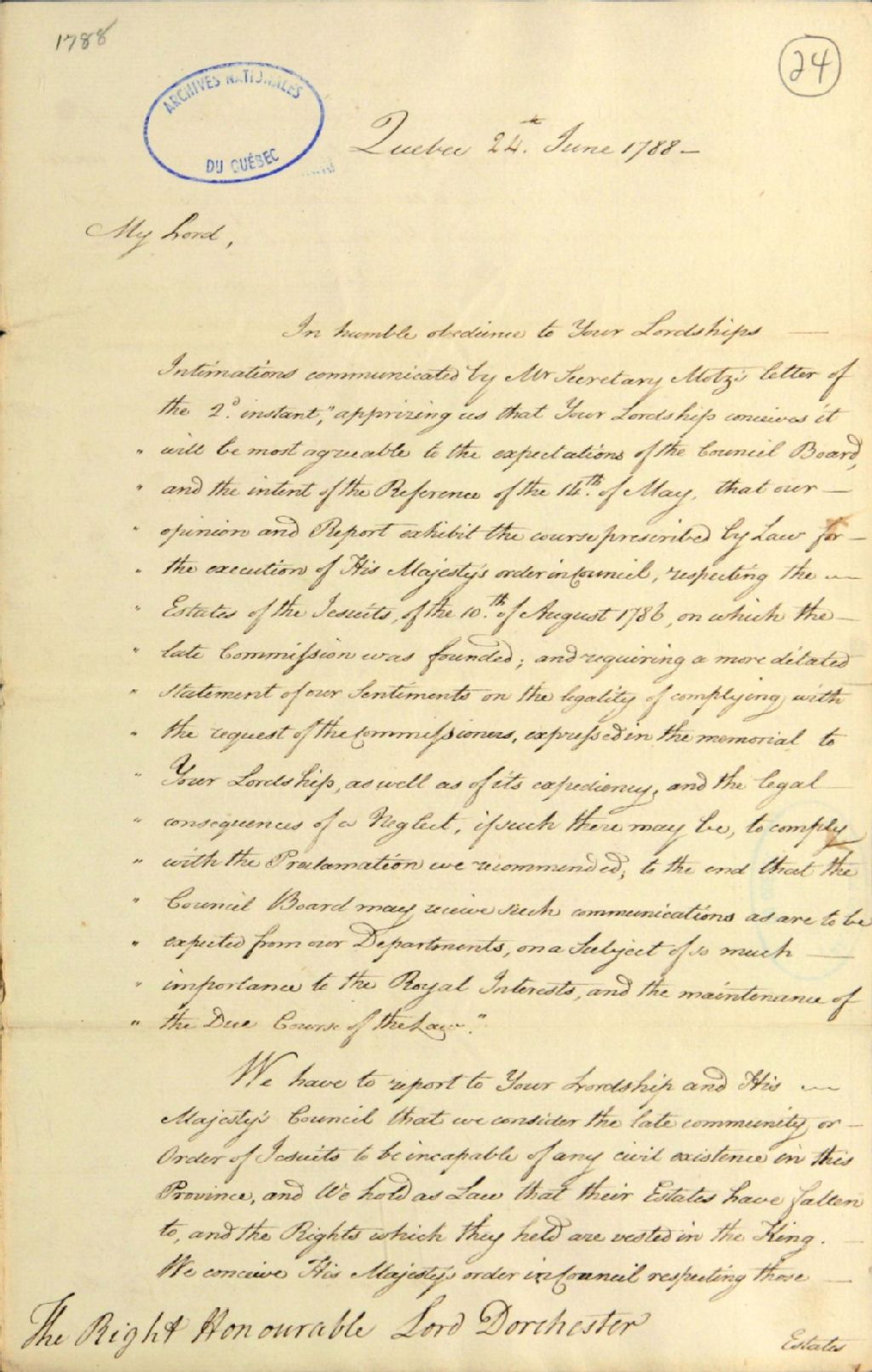 Rapport du procureur général (James Monk) et du solliciteur général (Jenkin Williams), adressé au gouverneur Dorchester, concernant la confection d'un papier-terrier pour les biens des Jésuites, 24 juin 1788, Archives nationales à Québec, Fonds Ministère des Terres et Forêts, (03Q,E21,S64,SS5,SSS2,D24).