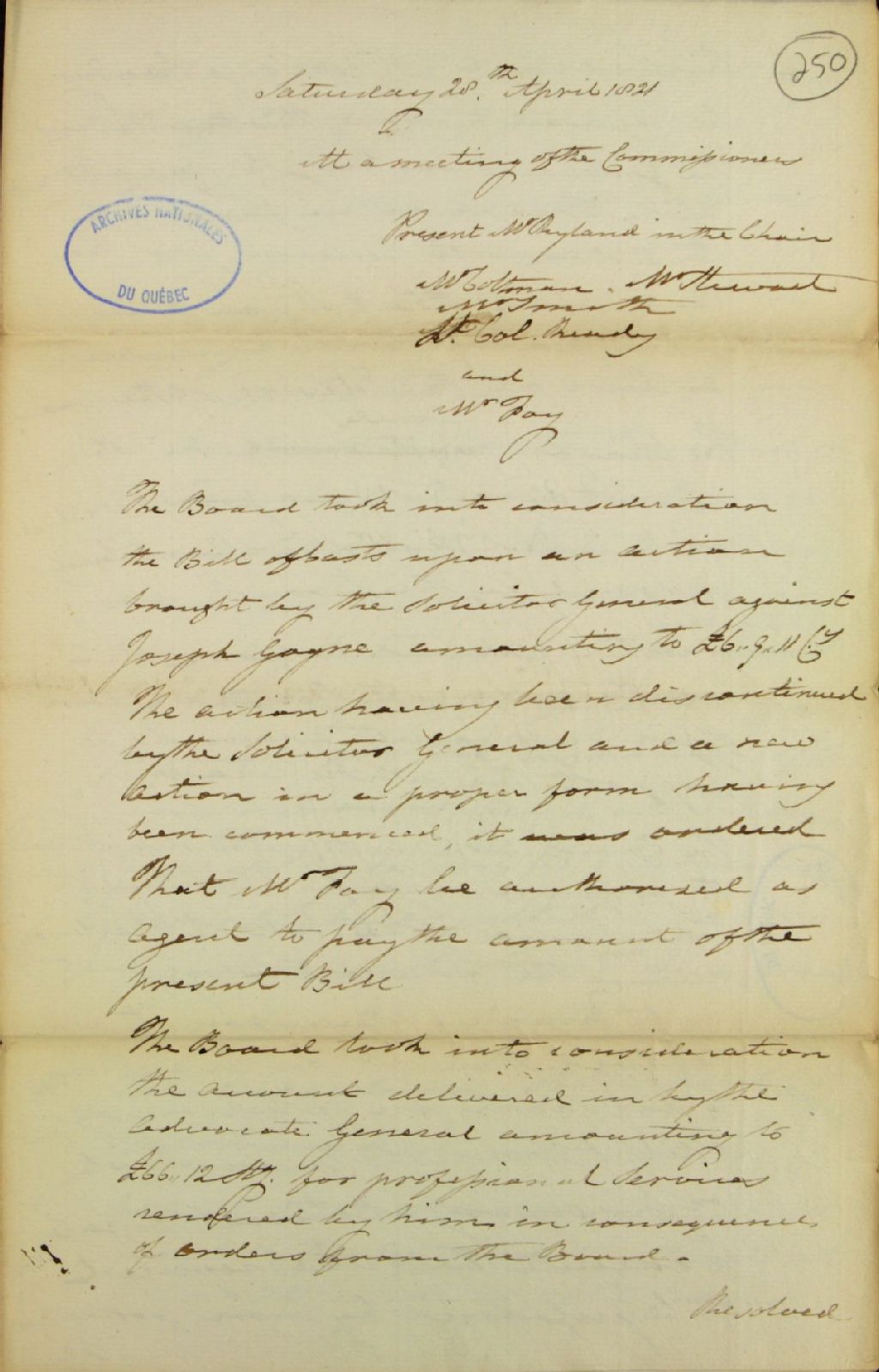 Brouillon d'un procès-verbal d'une réunion de la commission responsable de l'administration des biens des Jésuites, au sujet d'actions entreprises contre Joseph Gagné, par le solliciteur général et des frais en découlant; au sujet de frais réclamés par l'avocat général (George Vanfelson) pour services professionnels rendus; au sujet de la prise en charge du moulin de Charlesbourg par [Jean-Baptiste] Pitner (Bittner) durant le temps de sa réparation et de la rémunération qui lui est accordée; où un ordre demandant la création d'un acte notarié pour la vente de la petite ferme près du pont Dorchester à [Anthony] Anderson, à la suite de l'acception des termes de la vente par le gouverneur; au sujet de la préparation d'un acte notarié concernant le bail de LaVacherie (La Vacherie) et de la somme à accorder à Mme Lynd; au sujet de l'offre faite par [Jean] Turcot pour le bail du moulin à scie et celui à farine de New Lorette (Jeune-Lorette) (DBC), 28 avril 1821, Archives nationales à Québec, Fonds Ministère des Terres et Forêts, (03Q,E21,S64,SS5,SSS2,D250).