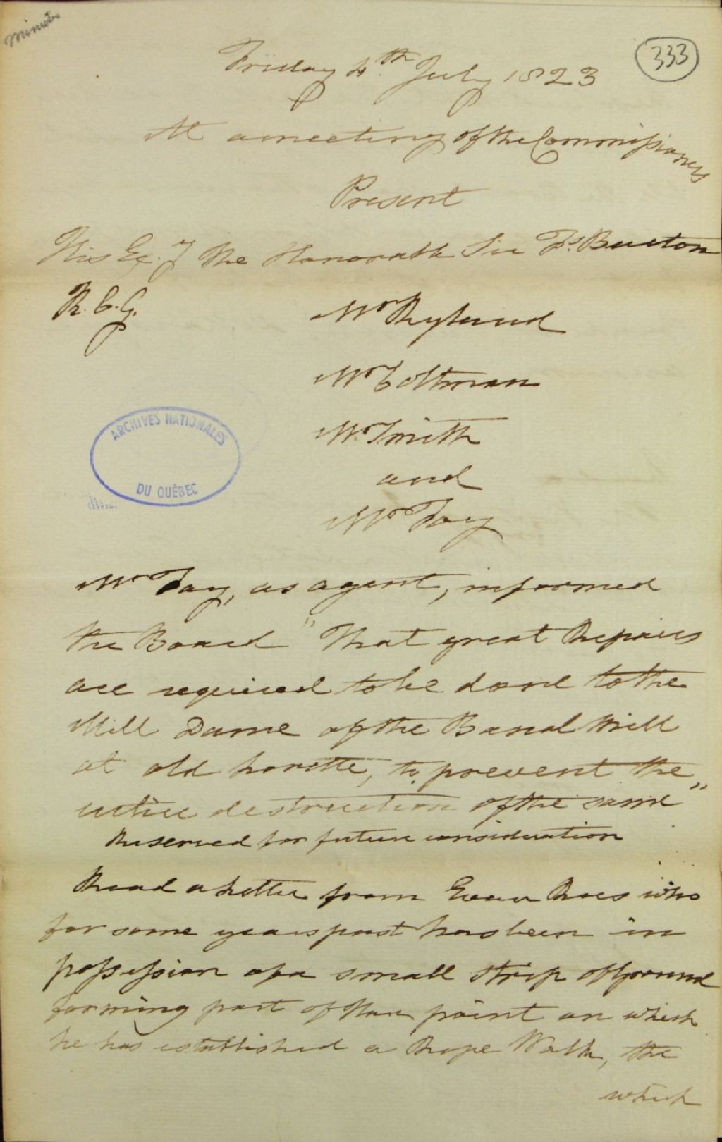 Brouillon d'un procès-verbal d'une réunion de la commission responsable de l'administration des biens des Jésuites, au sujet des réparations majeures qui doivent être entreprises sur le barrage du moulin banal de Old Lorette (L'Ancienne-Lorette); au sujet d'une lettre d'Evan Roes (Raux [?]), qui demande de prendre par bail une partie de la Pointe-aux-Lièvres («Hare Point»); au sujet d'une concession accordée par feu le père Casot (Jean-Joseph Casot), le 10 décembre 1799, à David Monro et Mathew Bell, dans la seigneurie de Cape Magdelaine (Cap-de-la-Madeleine) (DBC), 4 juillet 1823, Archives nationales à Québec, Fonds Ministère des Terres et Forêts, (03Q,E21,S64,SS5,SSS2,D333).