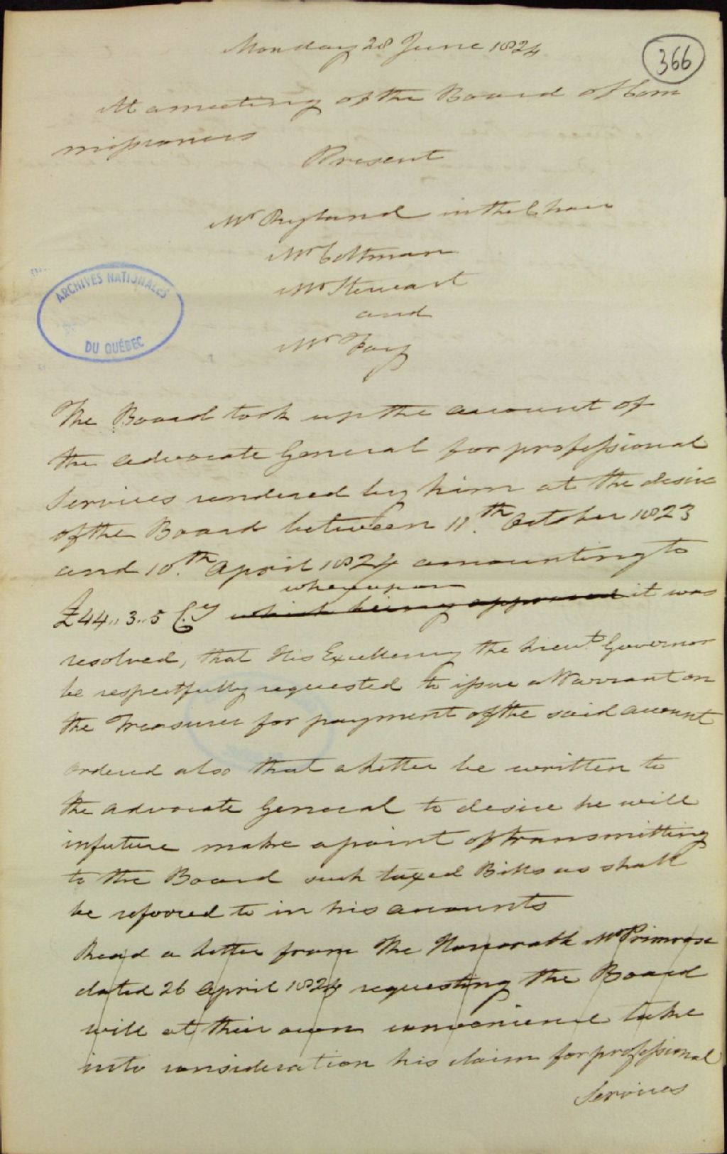 Brouillon d'un procès-verbal d'une réunion de la commission responsable de l'administration des biens des Jésuites, au sujet des frais encourus par l'avocat général (George Vanfelson) pour services professionnels rendus; au sujet des frais encourus par le procureur général pour services professionnels rendus; au sujet d'une lettre rapportant l'achèvement de l'arpentage de Pierre Déry et des frais encourus par ce dernier, accompli à la requête du seigneur de Guadarville (Gaudarville) et de Fossambault (Michel-Louis Juchereau Duchesnay); au sujet des comptes du [capitaine A.G.] Douglass, agent responsable des biens des Jésuites pour le district de Trois-Rivières (DBC), 28 juin 1824, Archives nationales à Québec, Fonds Ministère des Terres et Forêts, (03Q,E21,S64,SS5,SSS2,D366).