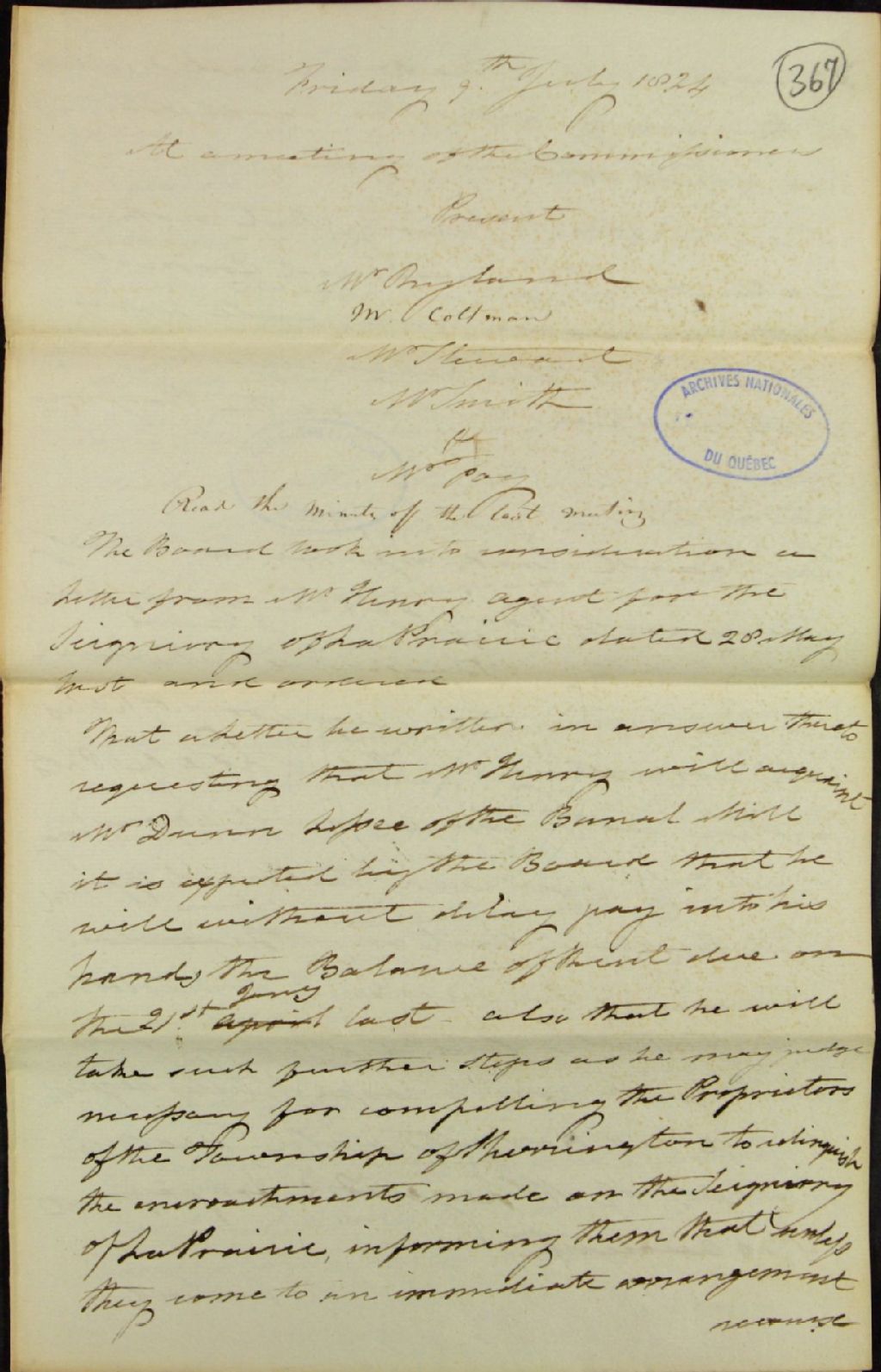 Brouillon d'un procès-verbal d'une réunion de la commission responsable de l'administration des biens des Jésuites, au sujet des arrérages de [James] Dunn, locataire du moulin banal de la seigneurie de LaPrairie (Prairie-de-la-Madeleine); au sujet des démarches à entreprendre pour contraindre les propriétaires du canton de Sherrington à arrêter leurs empiètements dans ladite seigneurie avant d'en venir aux recours légaux; au sujet de la construction d'un moulin dans ladite seigneurie (Scott, Yule); au sujet de l'aménagement de concessions sur les rives de la rivière des Envies par les arpenteurs provinciaux [Louis] Legendre et [Joseph] Hamel, ainsi que des frais qu'ils ont encourus; au sujet d'une somme à accorder à l'avocat Primrose pour services professionnels rendus; au sujet d'une lettre du [capitaine A.G. Douglass], agent responsable des biens des Jésuites pour le district de Trois-Rivières, expliquant ses comptes, 9 juillet 1824, Archives nationales à Québec, Fonds Ministère des Terres et Forêts, (03Q,E21,S64,SS5,SSS2,D367).