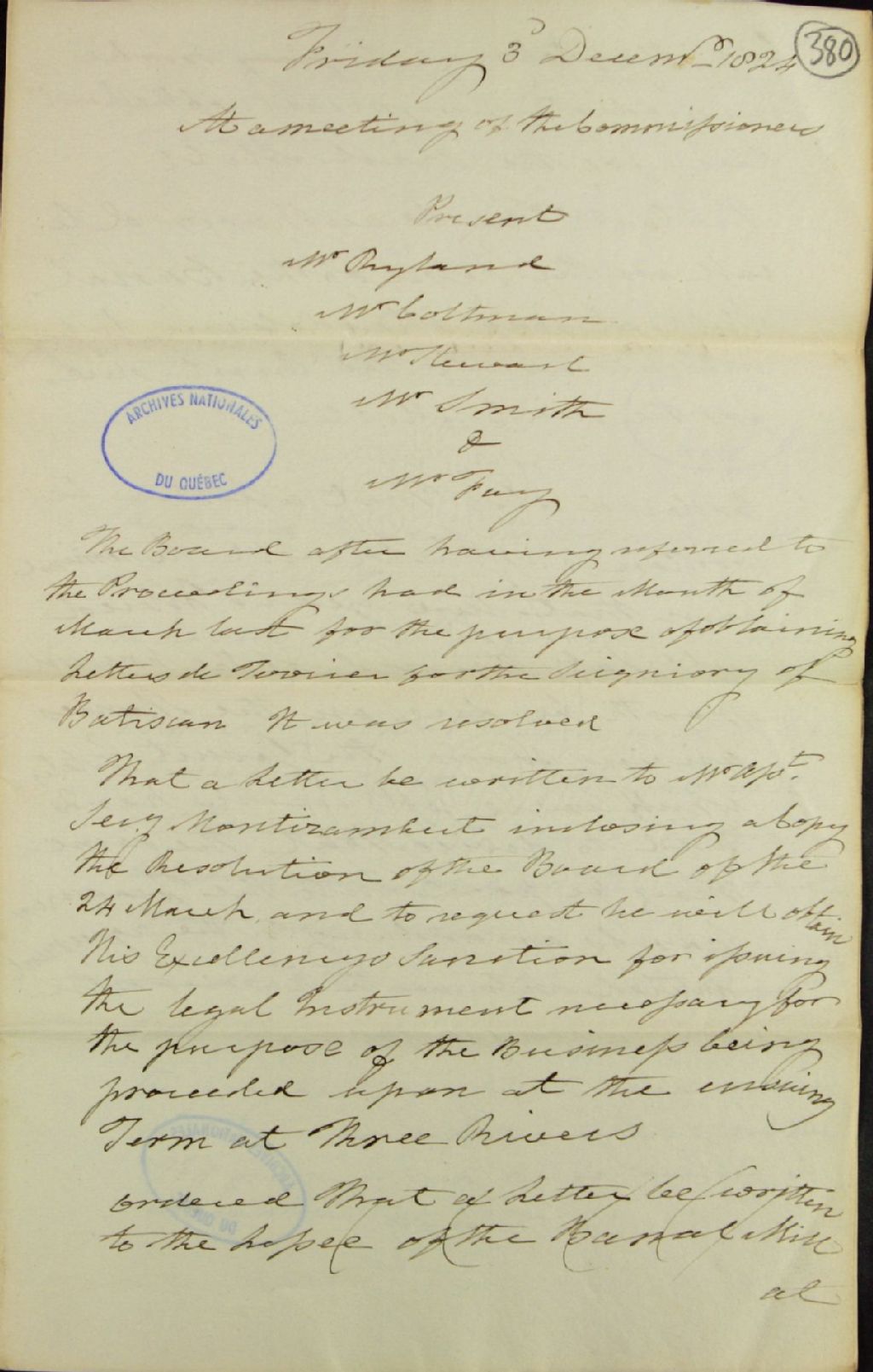 Brouillon de procès-verbaux de deux réunions de la commission responsable de l'administration des biens des Jésuites, au sujet de l'obtention de lettres de terrier pour la seigneurie de Batiscan; au sujet d'arrérages sur le moulin banal de Cape Madelaine (Cap-de-la-Madeleine); au sujet d'arrérages sur les d'anciennes propriétés jésuites laissées entre les mains de [John] Caldwell; au sujet de la proposition de Michael Scott de construire un moulin à farine dans la seigneurie de LaPrairie (Prairie-de-la-Madeleine); au sujet de frais encourus par l'agent responsable des biens des Jésuites pour le district de Québec (Lewis Foy), 3 décembre 1824 - 11 décembre 1824, Archives nationales à Québec, Fonds Ministère des Terres et Forêts, (03Q,E21,S64,SS5,SSS2,D380).