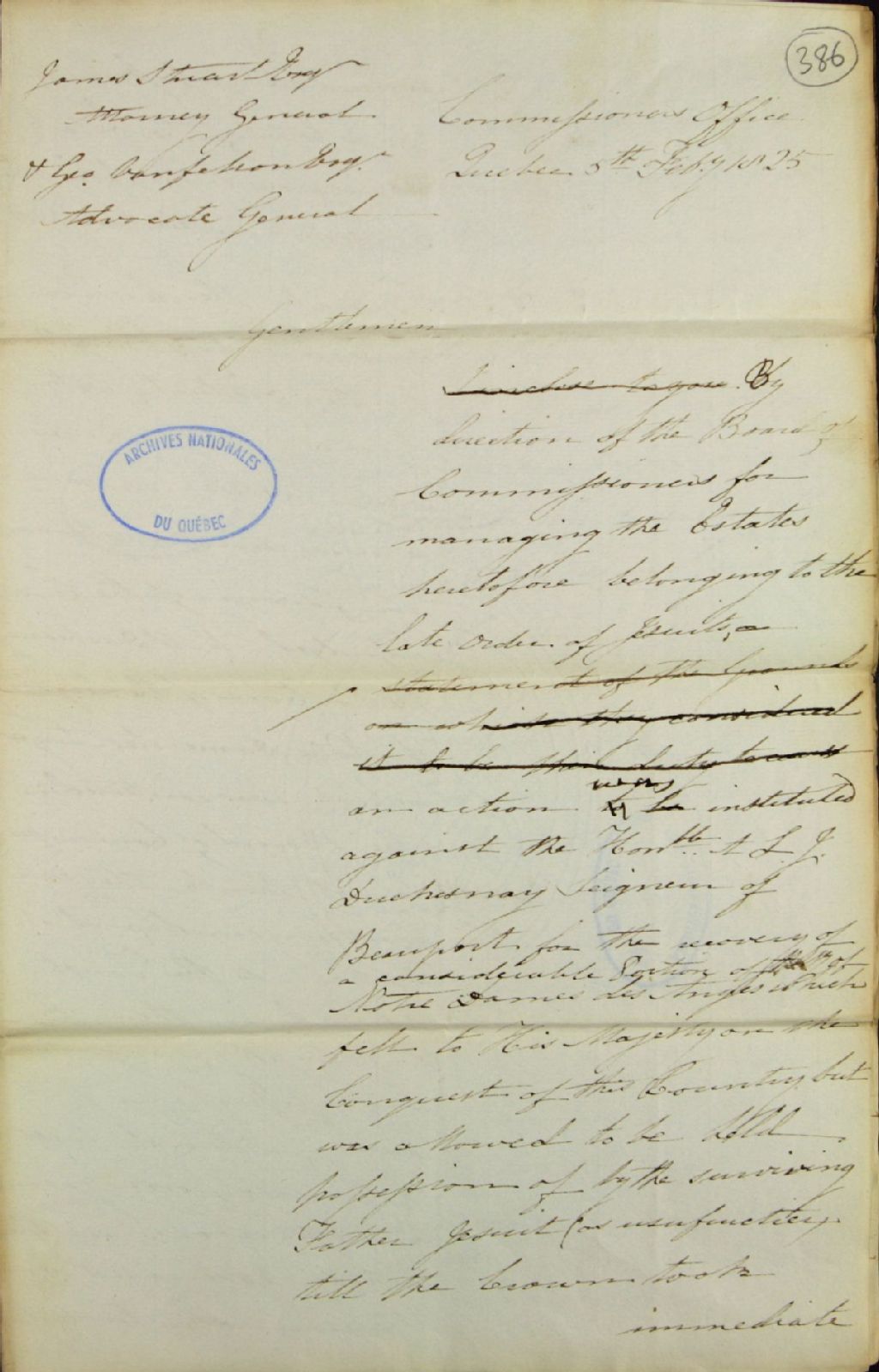 Brouillon d'une lettre envoyée à James Stuart, procureur général, et à [George] Vanfelson, avocat général, et signée par George [Herman] Ryland, secrétaire de la commission responsable des biens des Jésuites, au sujet de la ligne de séparation entre les seigneuries de Beauport et de Notre Dame des Anges (Notre-Dame-des-Anges), 5 février 1825, Archives nationales à Québec, Fonds Ministère des Terres et Forêts, (03Q,E21,S64,SS5,SSS2,D386).
