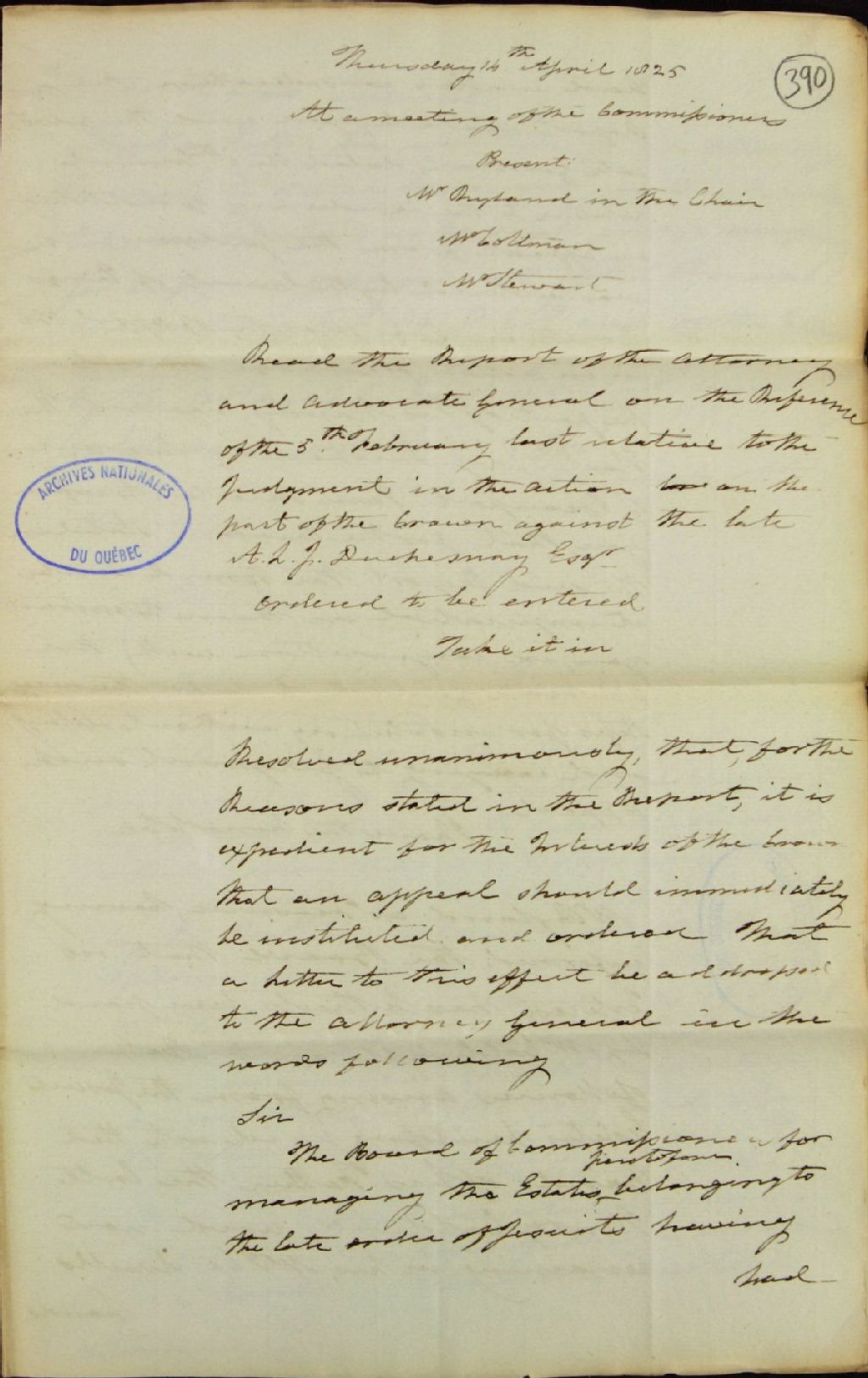 Brouillon d'un procès-verbal d'une réunion de la commission responsable de l'administration des biens des Jésuites, au sujet de la décision intervenue dans la cause opposant le Roi à [Antoine-Louis Juchereau] Duchesnay à propos de la ligne de séparation entre les seigneuries de Beauport et de Notre-Dame-des-Anges; au sujet des intérêts non remboursés par John Caldwell (DBC), 14 avril 1825, Archives nationales à Québec, Fonds Ministère des Terres et Forêts, (03Q,E21,S64,SS5,SSS2,D390).